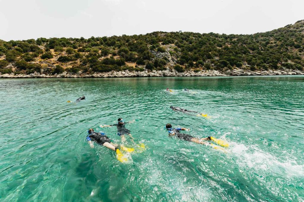 네아 마크리에서 스피드보트 스노클링 여행을 떠나 마라톤 케이프와 스키니아스 만의 수정처럼 맑은 바닷속을 탐험해 보세요. 스노클링 경험에 상관없이 만을 탐험하며 활기찬 수중 세계를 경험하세요.