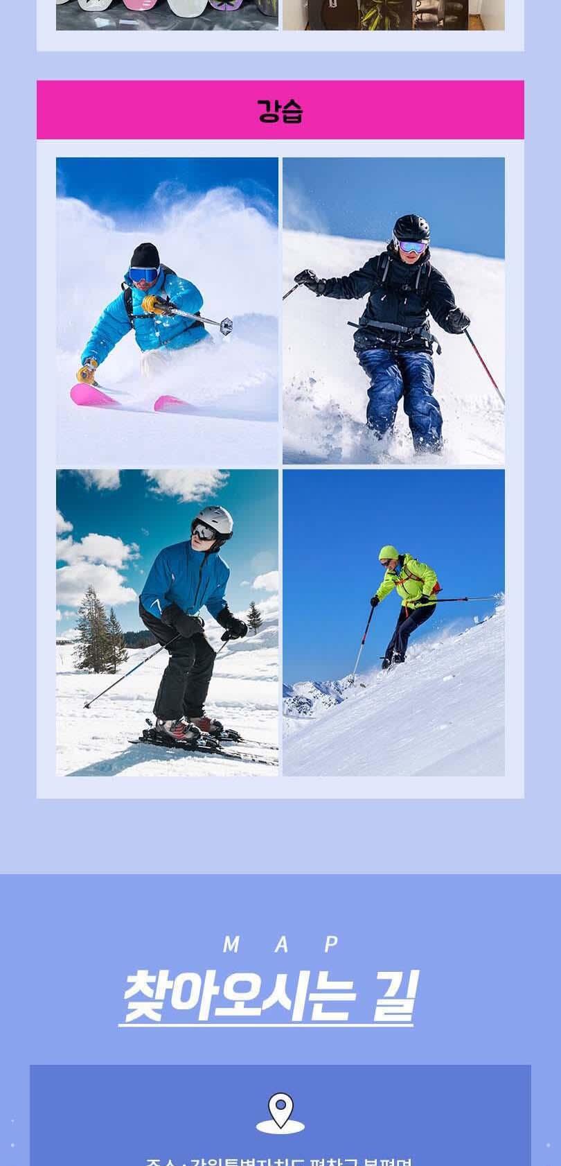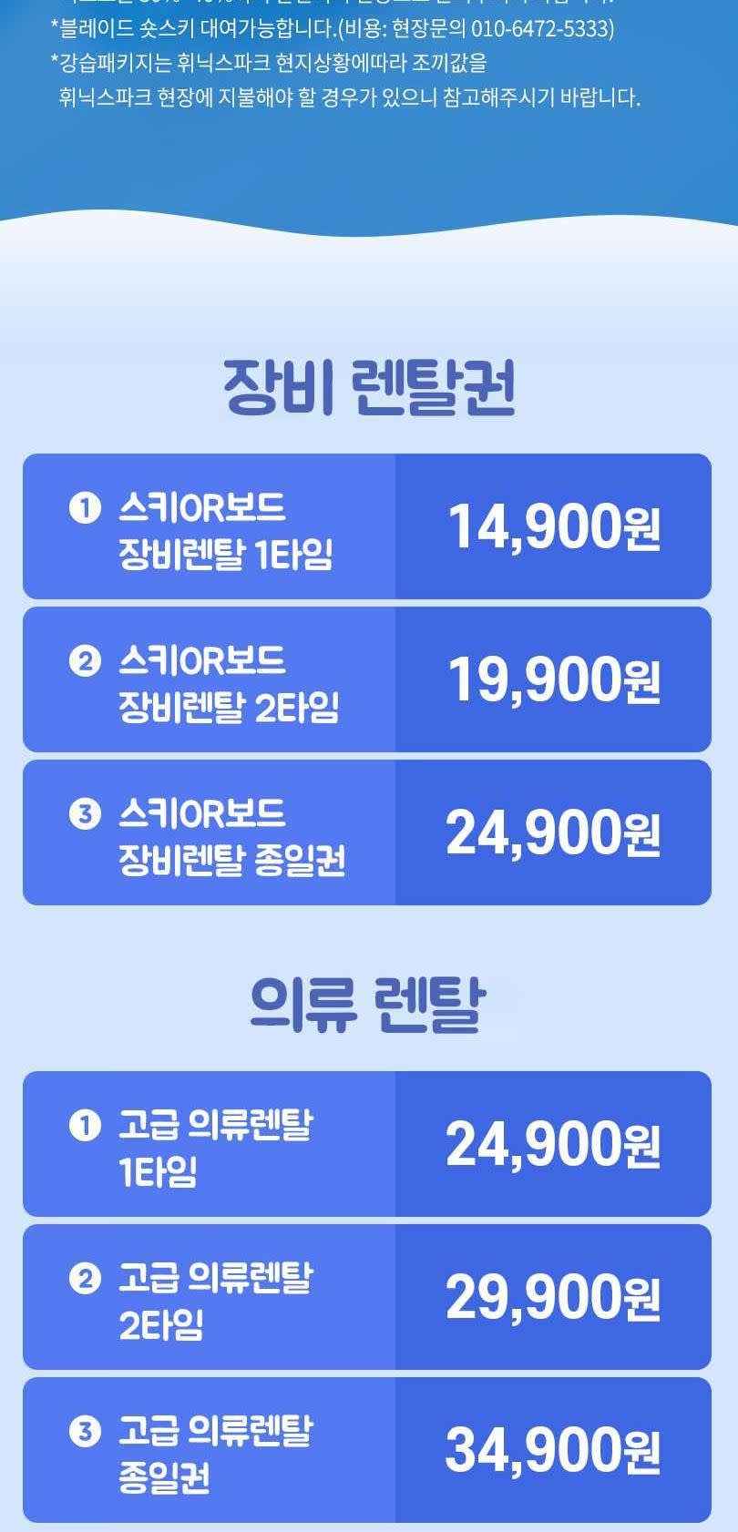 [이용 정보] * 판매기간 : ~ 2026.03.30 * 유효기간 : 2025.11.26 ~ 2026.03.30 [사용 방법] * 픽업여부 : 없음(스키장에서 1분거리) * 해당 상품은 대/소인, 주중/주말 동일한 요금으로 적용됩니다. * 모든 상품은 구매 1시간후 현장으로 전화예약 하셔야 이용가능합니다. * 강습상품 구성에는 장비 및 의류가 포함되어 있지 않으므로 렌탈샵에서 따로 렌트하셔야 합니다. * 렌탈상품은 주중에만 당일구매/당일사용 가능하며, 단 구매 후 전화예약은 필수입니다. * 타임추가에 관한 내용은 현장으로 문의주시기 바랍니다.(010-6472-5333) * 장갑,모자판매/고글,보호대,헬맷대여가능합니다. 현장으로 문의 주세요! * 스키장에서 1분거리이며, 별도의 픽업은 운영하지 않습니다. * 리프트는 30%~40%까지 할인되며 현장으로 문의주시기 바랍니다. * 블레이드 숏스키 대여가능합니다.(비용: 현장문의 010-6472-5333) * 강습패키지는 휘닉스파크 현지상황에따라 조끼값을 휘닉스파크 현장에 지불해야 할 경우가 있으니 참고해주시기 바랍니다. * 1. 이용 1일 전 원하는 상품 구매 - 단, 렌탈상품은 주중에만 당일구매/당일사용가능 - 별도의 SMS는 전송되지 않습니다. * 2. 구매 1시간 후 현장으로 유선 예약 필수 - 유선예약 : 010-6472-5333 * 3. 현장방문, 고객 성함 및 휴대폰번호 확인 후 이용