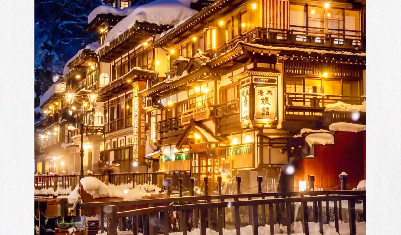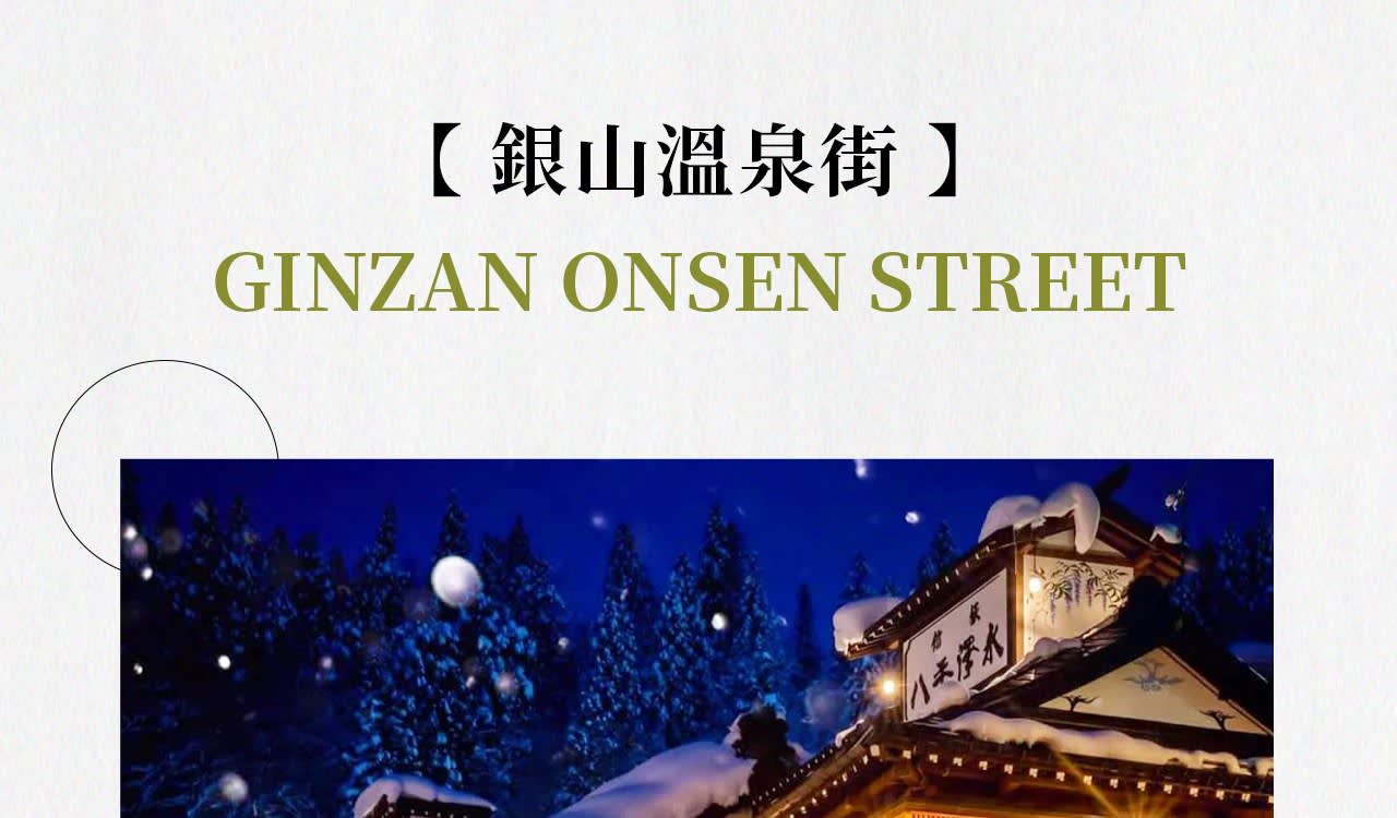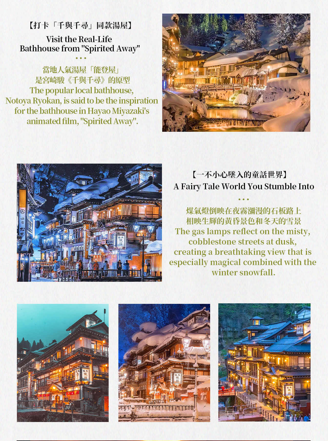 # 첫째 날, 일본 도호쿠 지방의 대표적인 아름다움이 있는 【긴잔 온천】으로 이동합니다. 겨울의 긴잔 온천 거리는 하얀 눈으로 덮여 매우 낭만적이며, 강변을 따라 산책하며 복고풍 목조 여관과 여기저기 켜진 불빛이 있는 온천 마을 풍경을 감상하면 마치 백 년 전의 일본으로 시간 여행을 떠난 듯합니다.