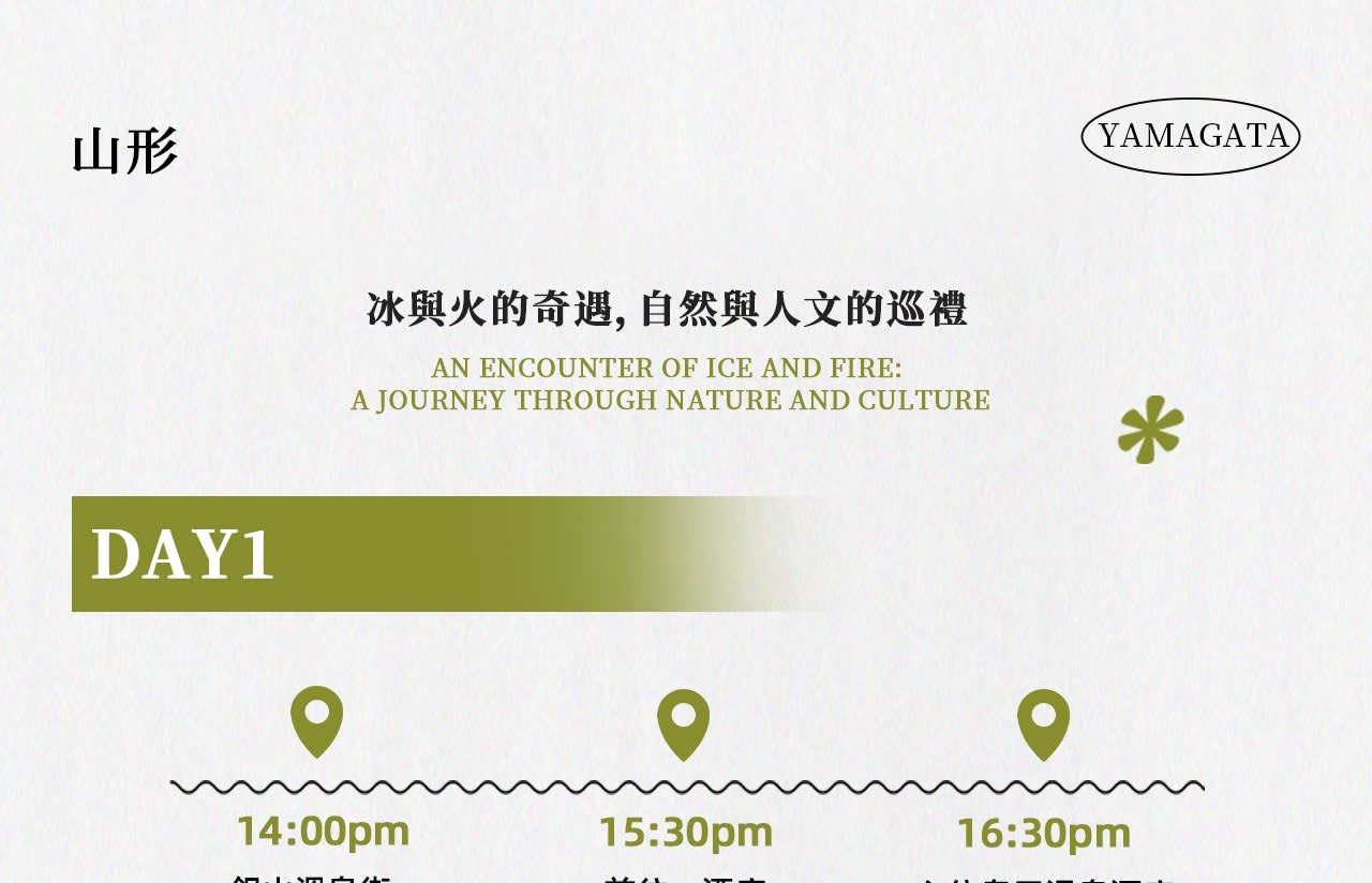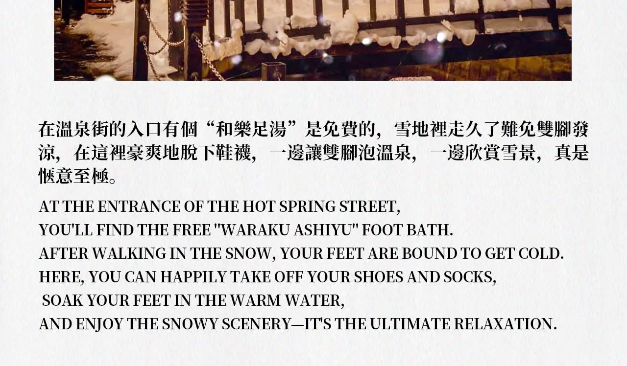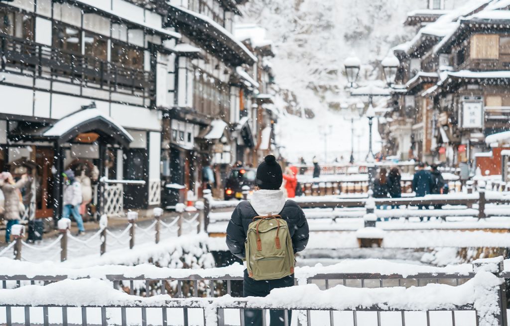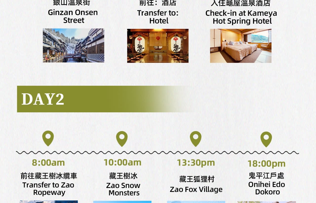 # 첫째 날, 일본 도호쿠 지방의 대표적인 아름다움이 있는 【긴잔 온천】으로 이동합니다. 겨울의 긴잔 온천 거리는 하얀 눈으로 덮여 매우 낭만적이며, 강변을 따라 산책하며 복고풍 목조 여관과 여기저기 켜진 불빛이 있는 온천 마을 풍경을 감상하면 마치 백 년 전의 일본으로 시간 여행을 떠난 듯합니다.
