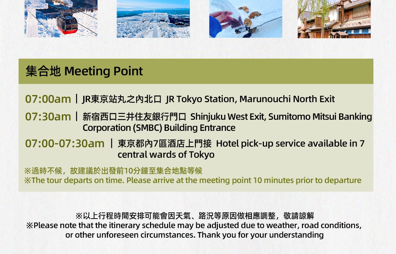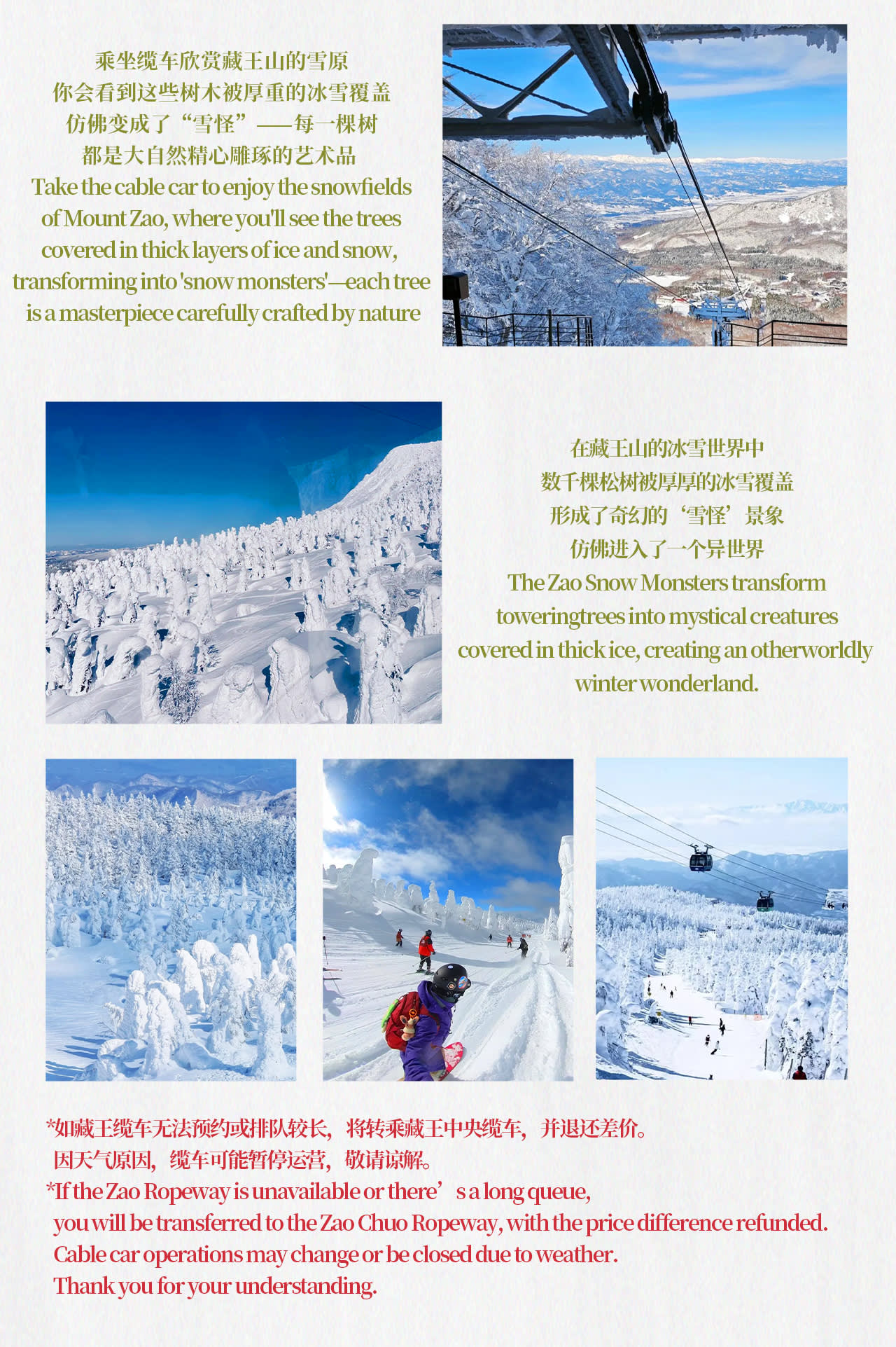 # 둘째 날, 【자오 수빙】으로 이동하여 세계적으로 희귀한 자연 경관을 감상합니다. 새하얀 눈과 강한 바람이 만들어낸 기이한 "설괴(雪怪) 숲" 경관은 겨울에 꼭 봐야 할 감동적인 장관입니다. 그 후에는 귀여운 【자오 여우 마을】을 방문하여 활발한 아기 여우를 가까이에서 감상하고 특별한 동물 교감을 체험해 보세요. 귀경길에는 인기 있는 【오니헤이 에도 도코로】 휴게소에 들릅니다. 이곳은 에도 시대를 테마로 하여 맛집과 기념품이 모여 있어 에너지를 보충하고 기념품을 구입하기에 좋은 곳입니다. 저녁에 도쿄에 도착하여 잊을 수 없는 2일간의 설국 온천과 자연 경관 여행을 마무리합니다.