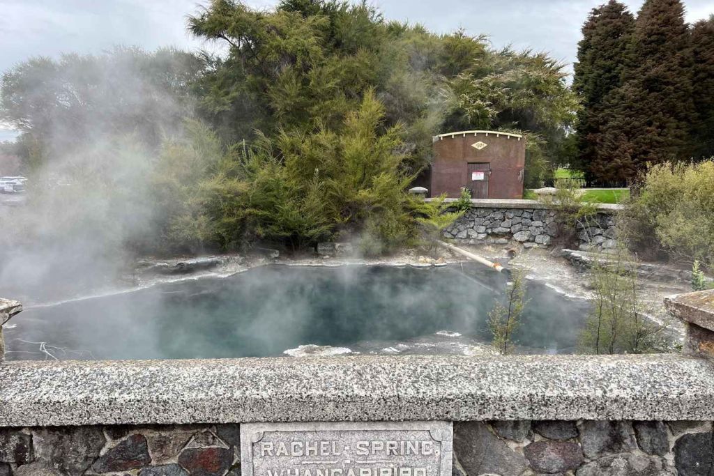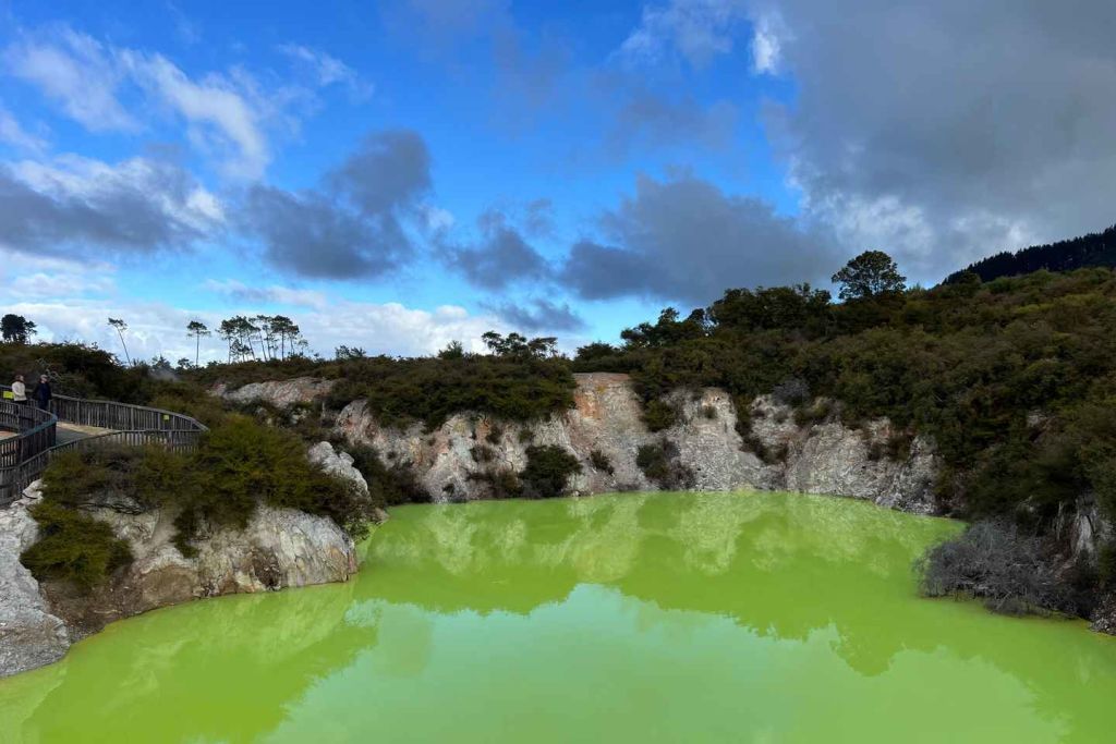 경치 좋은 시골을 드라이브한 후 첫 번째 방문지는 선명한 색의 지열 풀, 거품이 일렁이는 진흙탕, 인상적인 화산 분화구로 유명한 와이오타푸 열 원더랜드(Wai-O-Tapu Thermal Wonderland)입니다. 이곳에서는 레이디 녹스 간헐천이 증기와 뜨거운 물을 뿜어내며 분출하는 놀라운 광경을 목격할 수 있습니다.