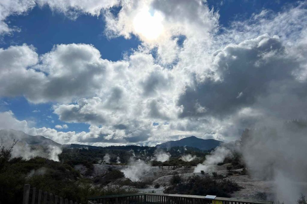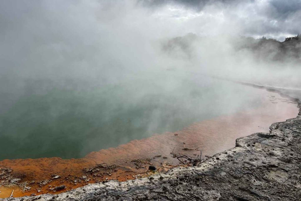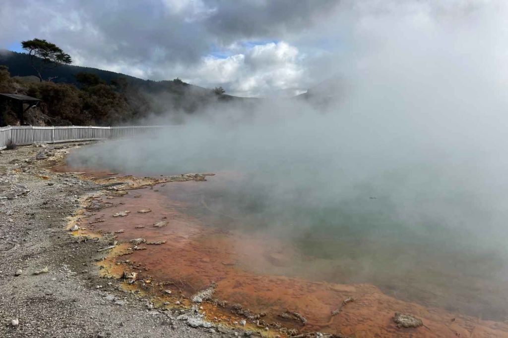 다음으로 뉴질랜드에서 가장 큰 와이오타푸 머드 풀(Wai-O-Tapu Mud Pool)을 방문해 끓는 진흙이 다른 세상의 에너지로 튀어 오르고 거품을 일으키며 지열 활동의 힘을 엿볼 수 있습니다.