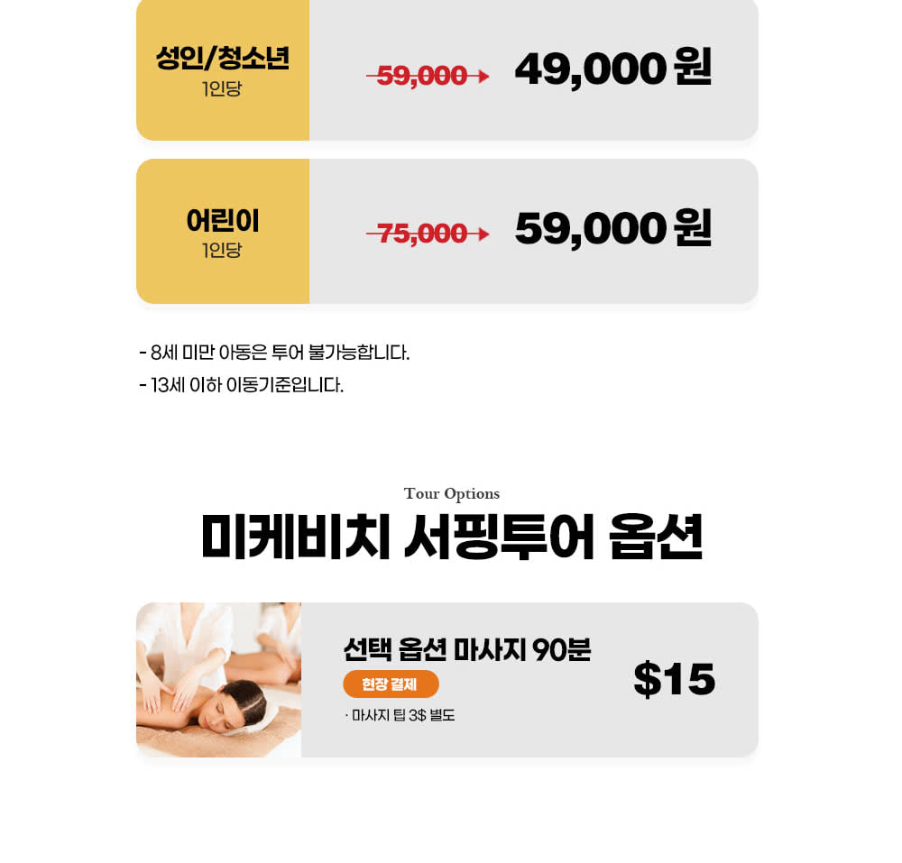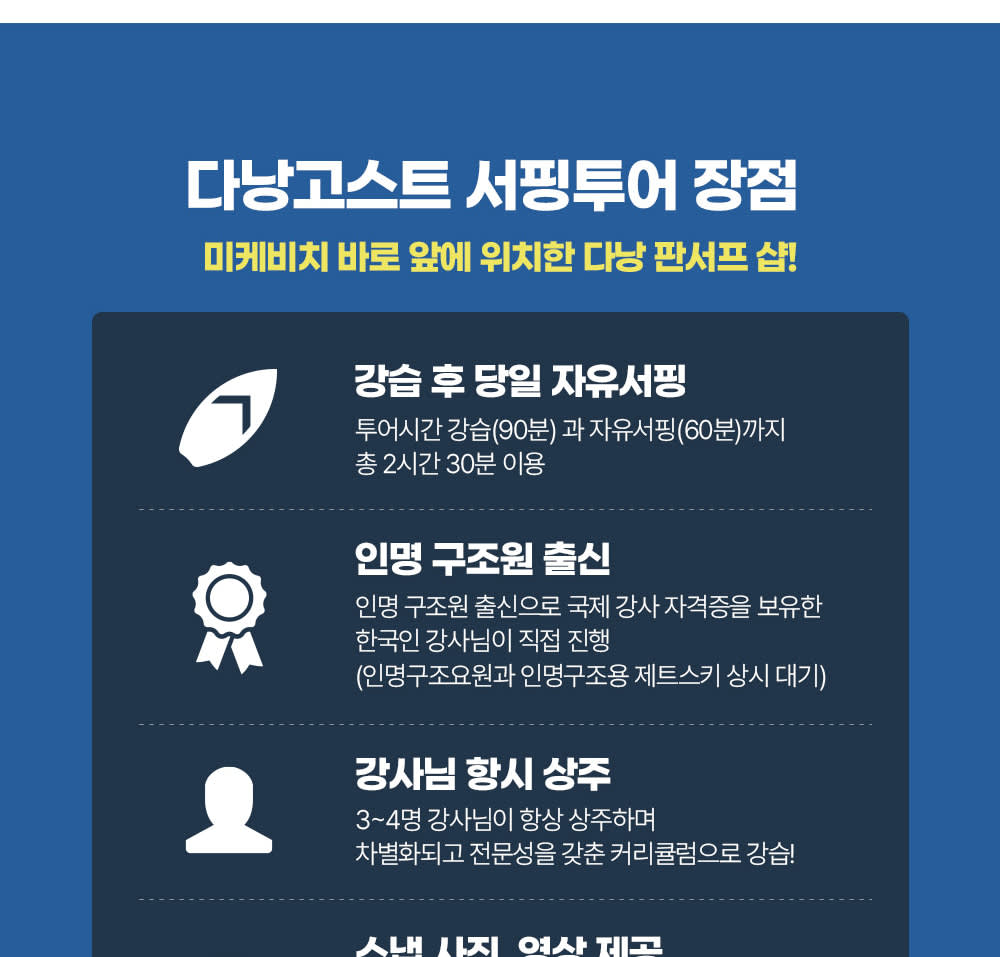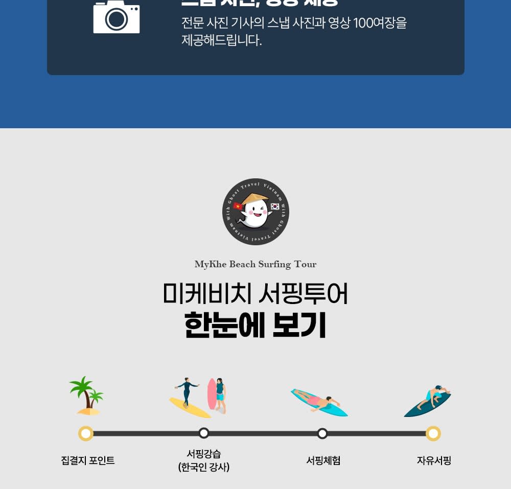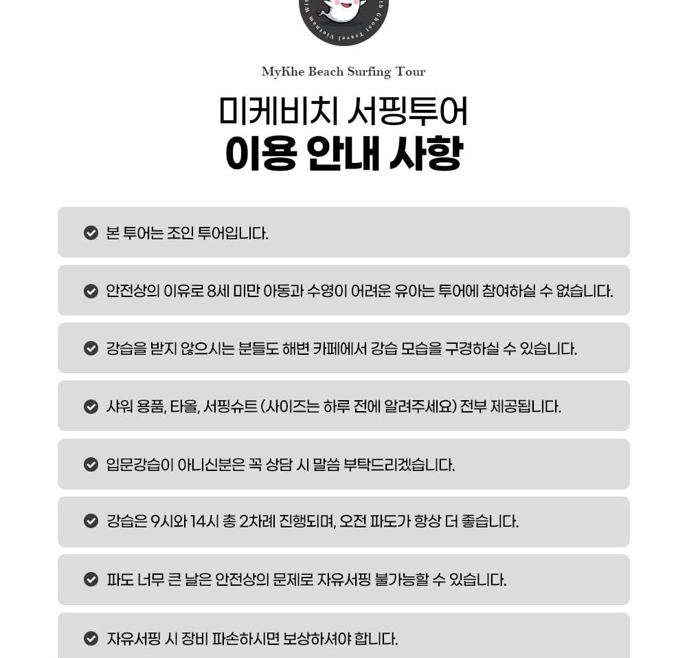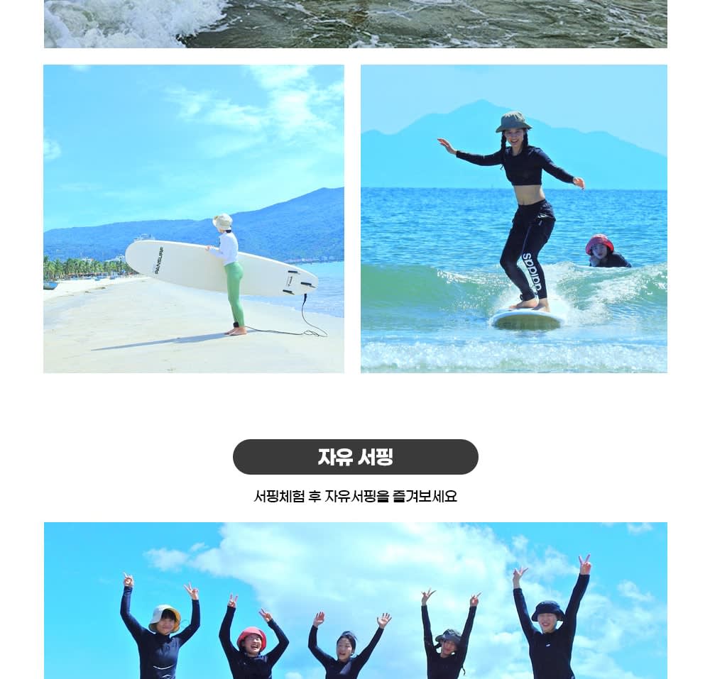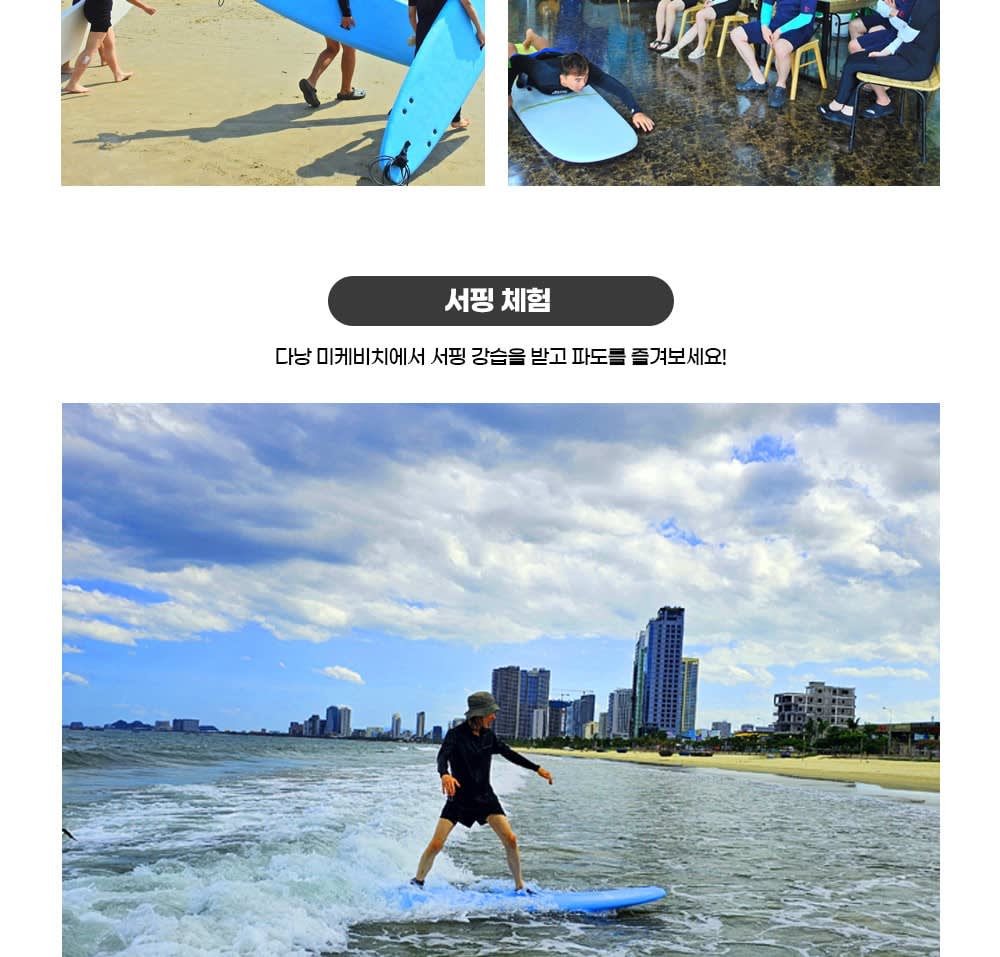 - 베트남에서 더 많은 투어를 즐기고싶다면, 에서 확인해보세요! * 다낭 미케비치에서 한국인 전문 강사님에게 서핑을 쉽고 재미 있게 배워 보세요. * 세계적인 해변 다낭 미케비치의 강력한 파도를 온 몸으로 느끼며 스릴을 즐겨 보세요. * 안전이 최우선이며, 미케비치 해변은 수심이 얕아 초중급자가 서핑을 즐기기 좋아요.