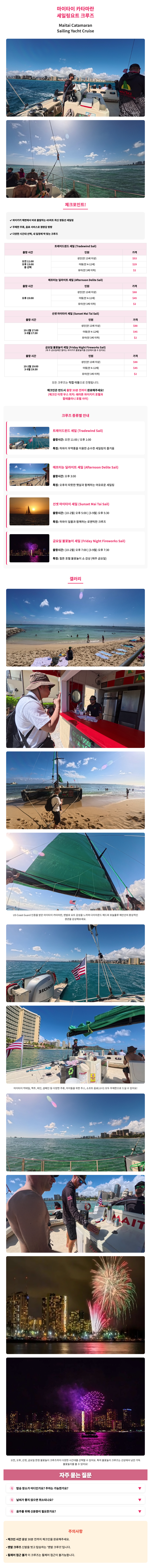 주의사항 체크인 시간 및 장소: 예약하신 출항 시간 30분 전까지 체크인을 완료해야 합니다. 체크인 장소: 쉐라톤 와이키키 호텔과 할레쿨라니 호텔 사이 해변에 위치한 티켓 부스 예약 정보: 예약 시 모든 탑승객의 정확한 영문 성함이 필요합니다. 면책동의서: 탑승 전 현장에서 면책동의서 작성이 필요합니다. 신분증 지참: 주류를 이용할 경우, 나이 확인이 가능한 신분증(여권 등)을 반드시 지참해주세요. 스케줄 변경: 현지 기상 상황 및 안전 문제에 따라 출항 시간이 변경되거나 투어가 취소될 수 있습니다.