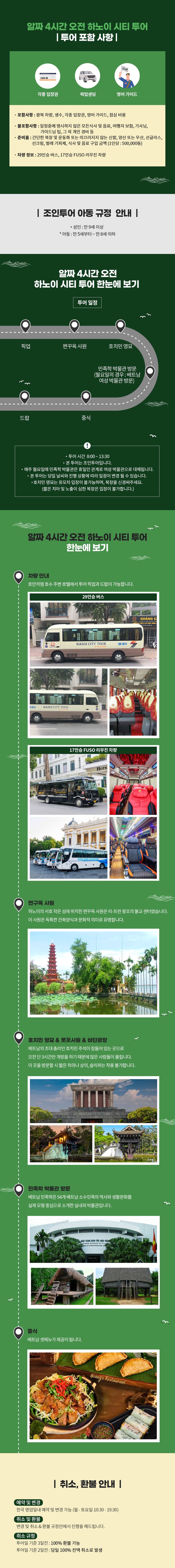 *안내 사항 - 1인부터 진행이 가능한 조인 투어입니다. - 다국적 여행객들과 같이 다니는 조인 투어입니다. - 영어 현지 가이드가 행사 기준입니다. - 투어 하루 전 21:00 이전 픽업 안내를 해드립니다. - 호안끼엠 호텔 픽업이 가능하며 하노이 시외(박닌, 박장, 하이퐁등)은 픽업 불가합니다. - 상기 일정은 날씨 또는 현지 상황에 따라 변경될 수 있습니다. - 17인승 리무진 차량이나 29인승 버스로 투어를 진행합니다. 차량안에 짐 보과 가능합니다. (실제 상황에 따라 확인 필요합니다.) - 유아(무료) 동반 시 보호자와 좌석을 함께 사용해야 합니다. 카시트를 제공 불가능합니다. *주의 사항: - 만 3세 이하 무료 (1m 미만) - 만 5세-8세 이하 어린이는 아동 요금 적용 (120cm 이상 성인으로 진행) - 만 9세 이상은 성인 진행 *개인의 부주의 등으로 인한 사고의 경우 가이드가 도움을 드리기 어려울 수 있습니다. *해외 여행 중 발생할 수 있는 만일의 사고를 대비하여 개인 여행자 보험 가입을 가급적 권장합니다. *최소 모객인원 미만 모객 시 투어가 취소될 수 있습니다. *투어 시 소지품을 분실하는 경우 되찾는 것이 어려우니 주의해주세요. *픽업 시간에 지각하시거나 나타나지 않으실 경우 투어 이용이 어려울 수 있습니다.