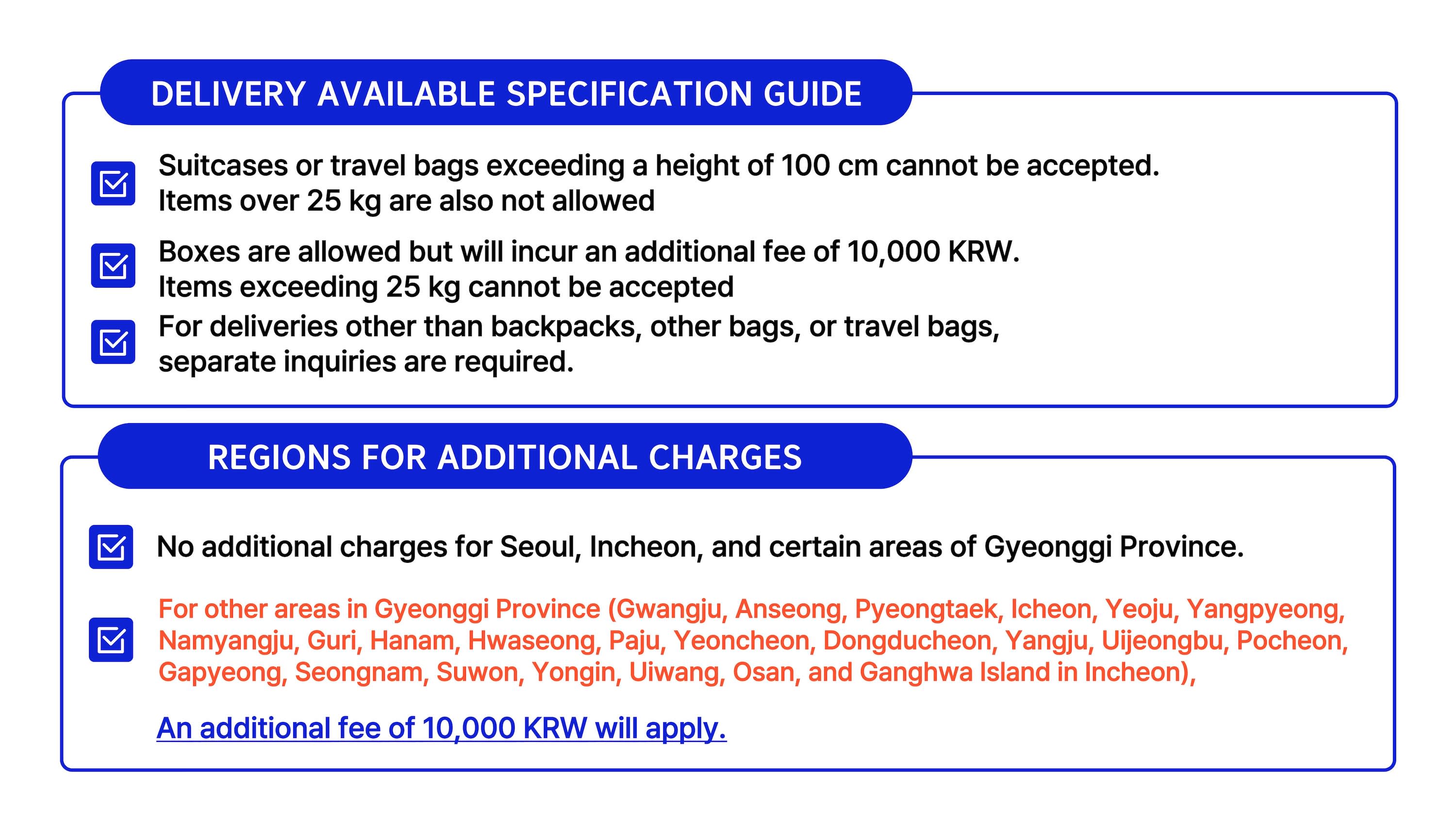 * ※ 숙소에 프런트 데스크가 없는 경우 문 앞까지 배송됩니다. 이 경우 분실물에 대해서는 책임지지 않습니다. 서비스를 이용함으로써 귀하는 이러한 조건에 동의하는 것입니다.