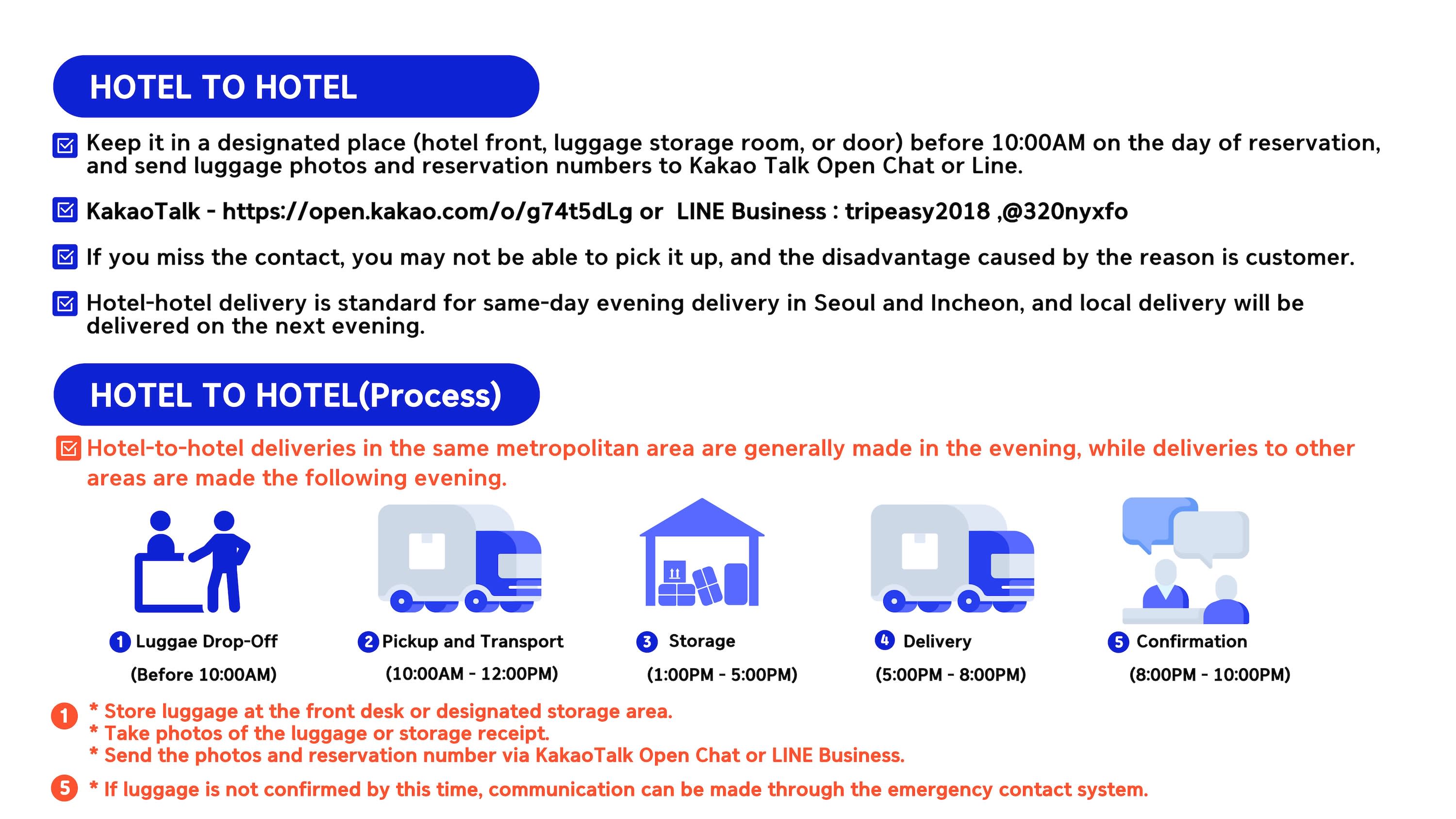 이동 서비스 당일 10:00까지 예약 번호, 호텔 이름, 수하물 사진을 Line business로 보내주시기 바랍니다.
