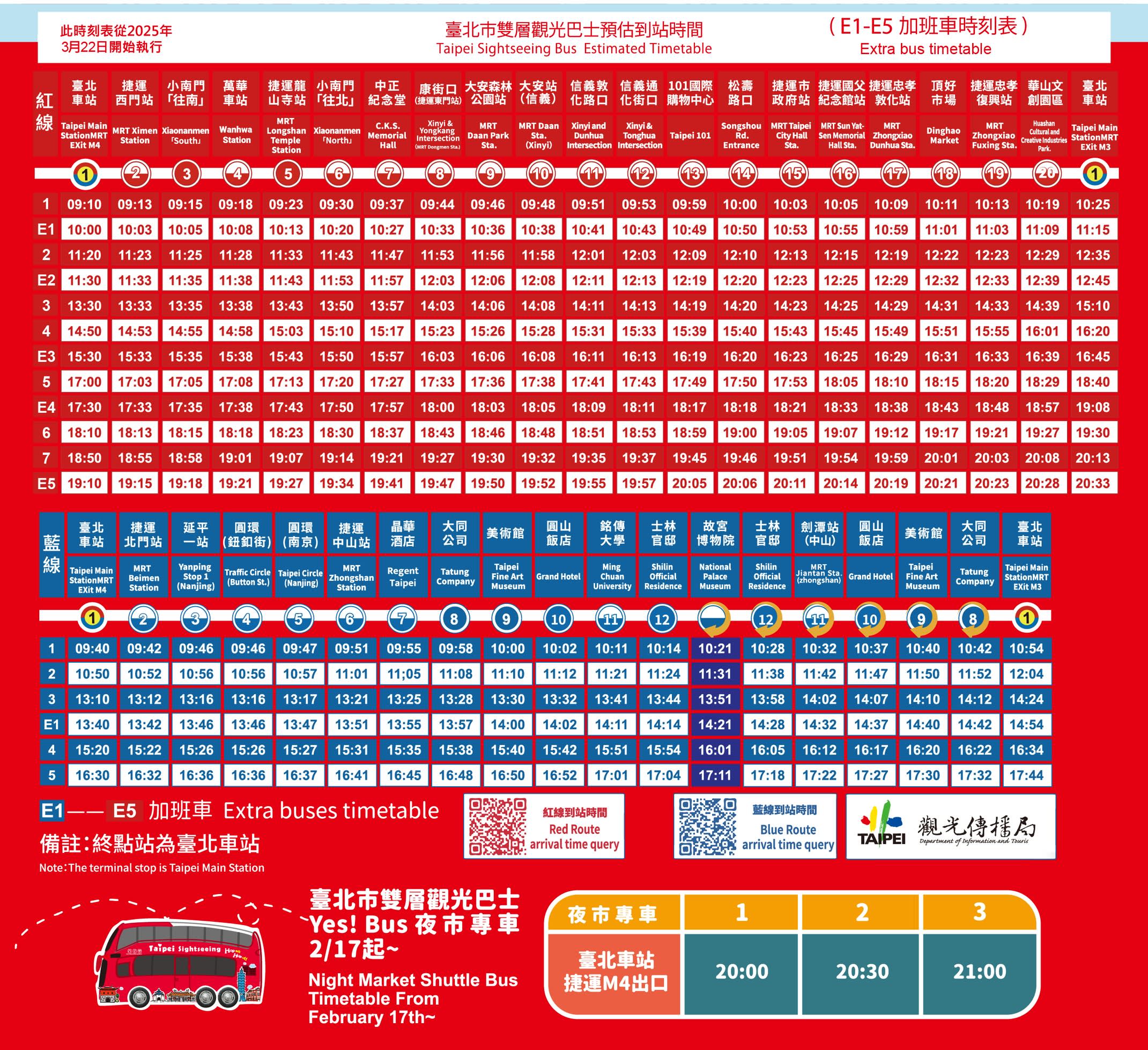 타이베이 2층 시티투어 버스는 강렬한 빨간색 외관에 2층은 반 개방형 좌석으로 되어 있으며, 인기 명소 그림이 그려져 있습니다. 타이베이 여행을 더욱 편리하고 로맨틱하게 만들어줄 멋진 아이템을 만나보세요! 낮과 밤 모두 이용 가능하며, 쑨원 기념관, 싱톈궁, 시먼홍러우 등 명소를 지나는 클래식 레드 및 블루 노선으로 나뉩니다. 차량에는 각 명소에 대한 정보를 쉽게 이해할 수 있도록 중국어, 영어, 일본어, 한국어 다국어 안내 시스템도 갖춰져 있습니다. 하루 종일 자유롭게 버스에 승하차하며 타이베이의 인기 명소를 편리하게 방문하세요. 타이베이의 인기 랜드마크를 자유롭게 여행하세요!