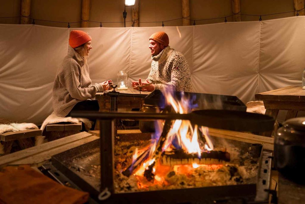 한편 다른 그룹은 개 마당을 방문해 따뜻한 식사와 음료를 즐기며 허스키에 대한 흥미로운 사실을 듣게 됩니다. 캠프에서 편안한 시간을 보낸 후, 개썰매에 필요한 장비를 갖추고 다가오는 개썰매 모험을 위해 필요한 교육을 받게 됩니다!