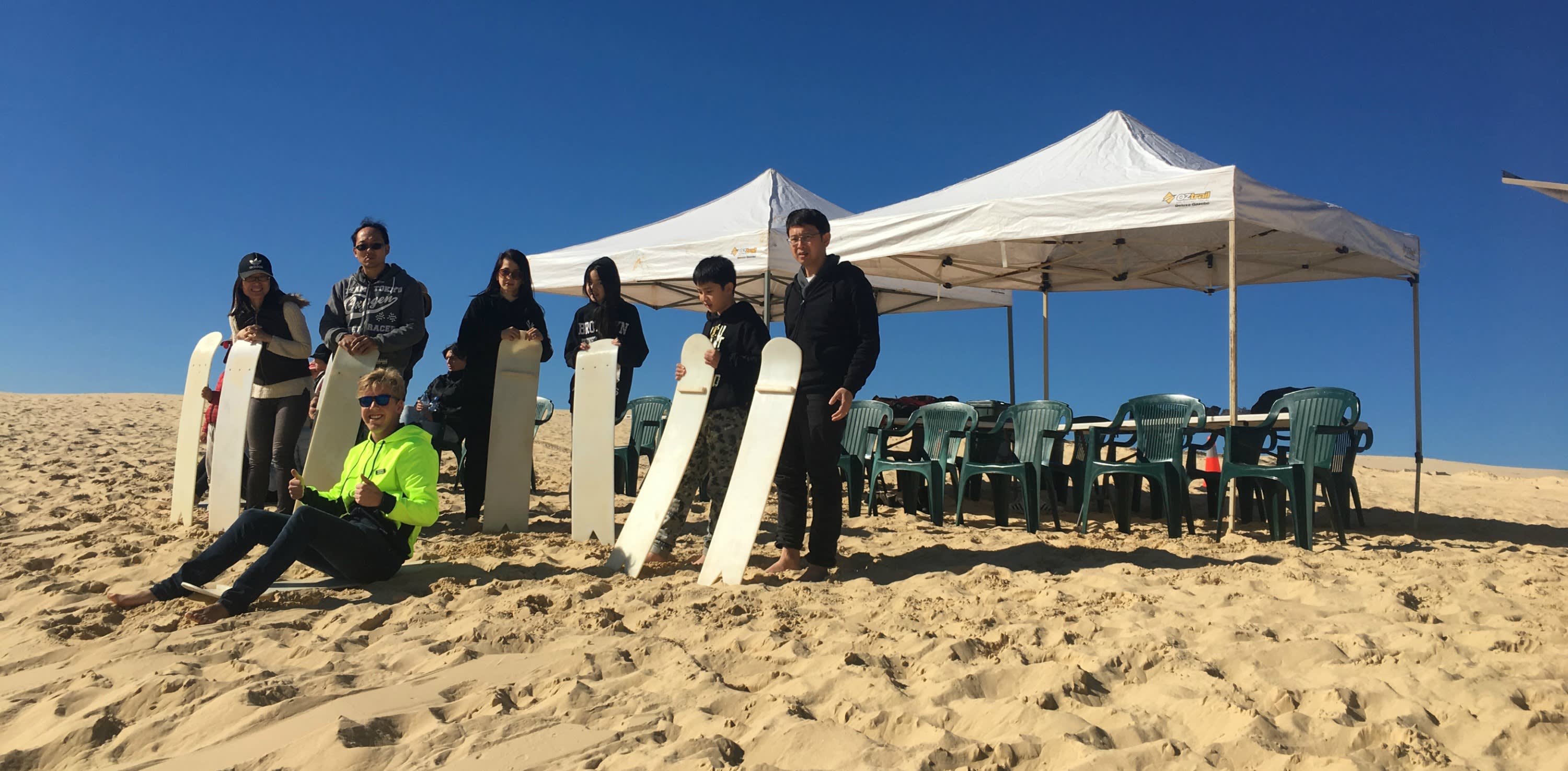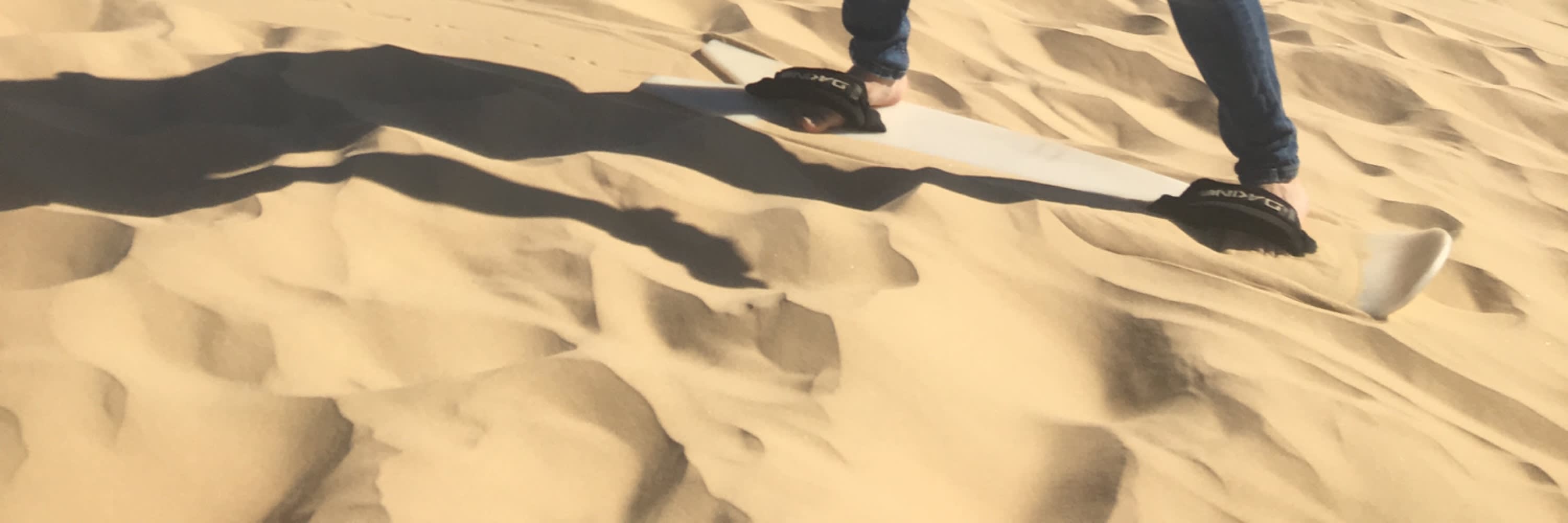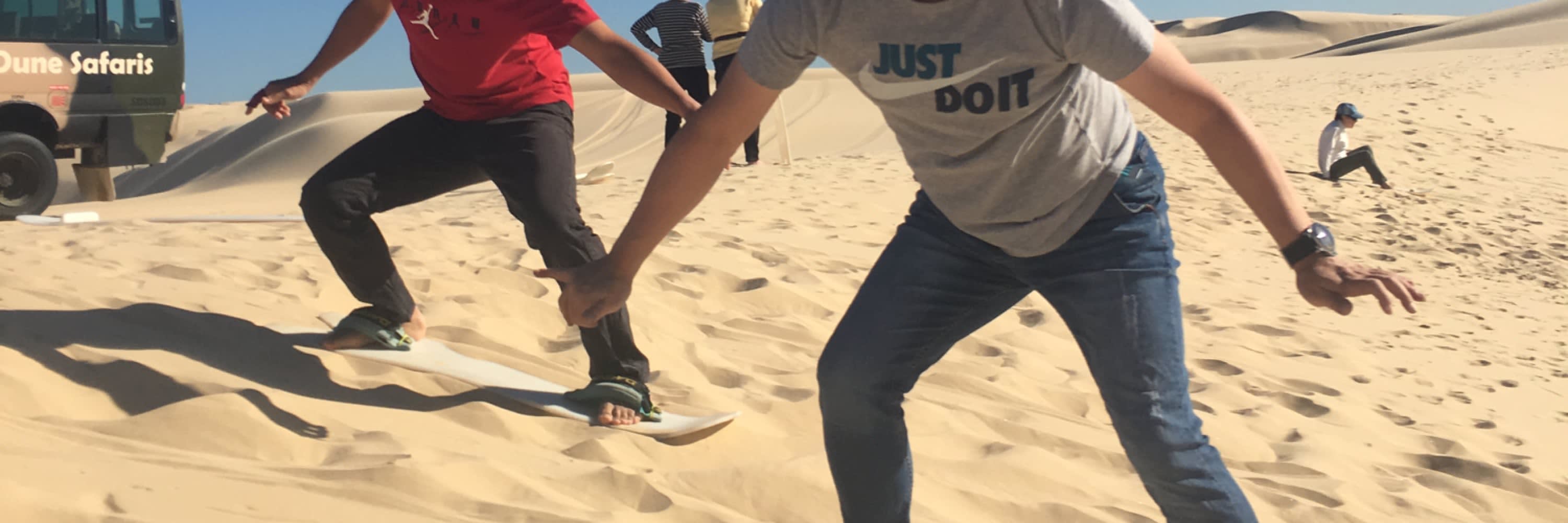친절한 강사 중 한 명이 안전한 샌드보딩 방법을 가르쳐 드립니다. 사구에는 작은 언덕, 중간 언덕, 큰 언덕이 있어 자신감 수준에 따라 선택할 수 있습니다.