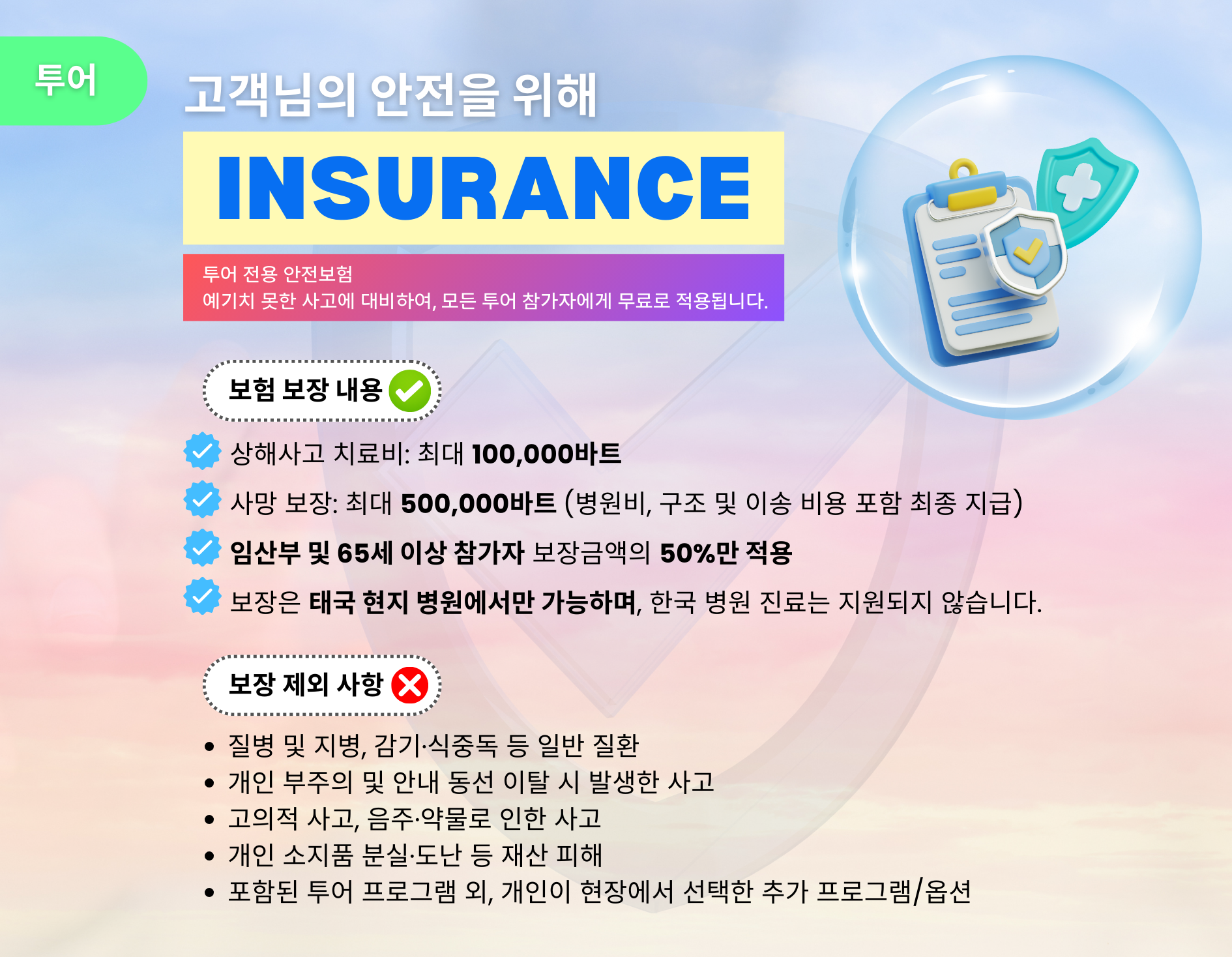 포함사항과 불포함사항을 꼭 확인해 주세요. 태국은 키를 기준으로 성인과 아동을 구분합니다. 성인 키 : 121cm이상 / 아동 키 : 90 - 120cm / 유아 키 : 89cm 이하 무료 성인과 아동 요금은 동일합니다. 아동 요금도 성인으로 결제하시면 됩니다. 참고로 카페 추가 이용 하실분들은 꼭 바우처 보내드리는 카톡 상담원에게 요청 해주셔야 진행 한점 참고 해주세요~ 25년 9월 10일 이후 부터 상해 보험은 상품설명 맨위쪽에 있는 내용으로 진행 되는점 참고 해주세요~! ㆍ업체명 : SST Global 본 상품은 아시아패스에서 상담만 진행하고 실제 운영및 판매는 "SST Global" 에서 주관합니다. 상품 운영에 대한 책임은 "SST Global" 에 있습니다. - 투어 참가시 귀중품 및 현금 등의 분실사고와 개인의 안전사고에 대해 각별히 유의해 주세요. - 개인 부주의로 발생된 사고는 책임지지 않습니다.