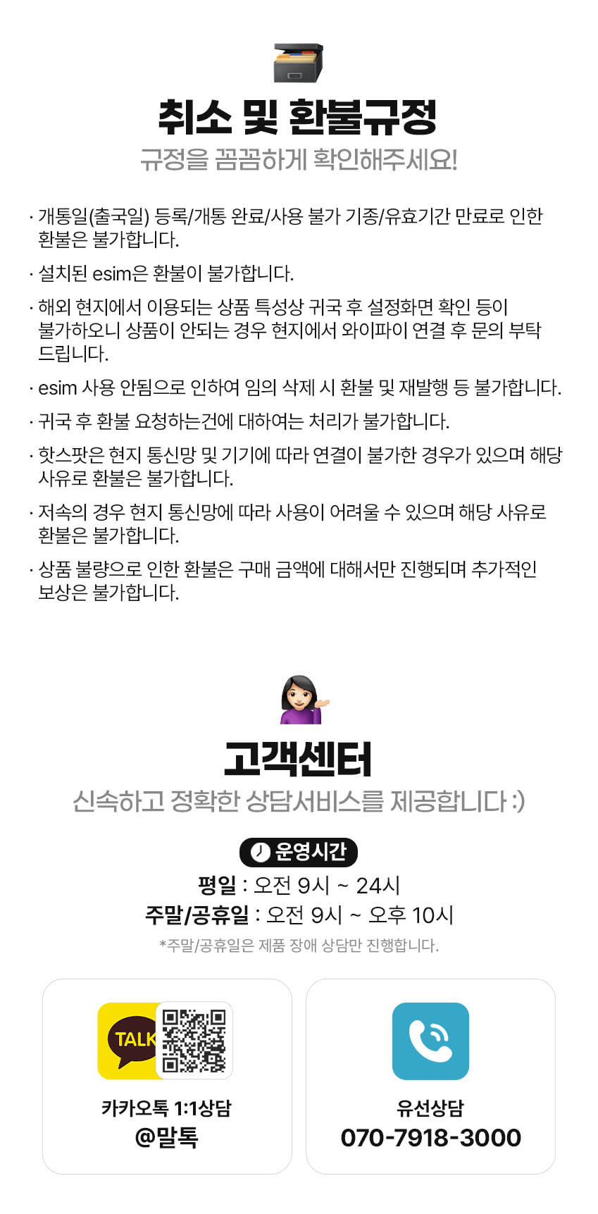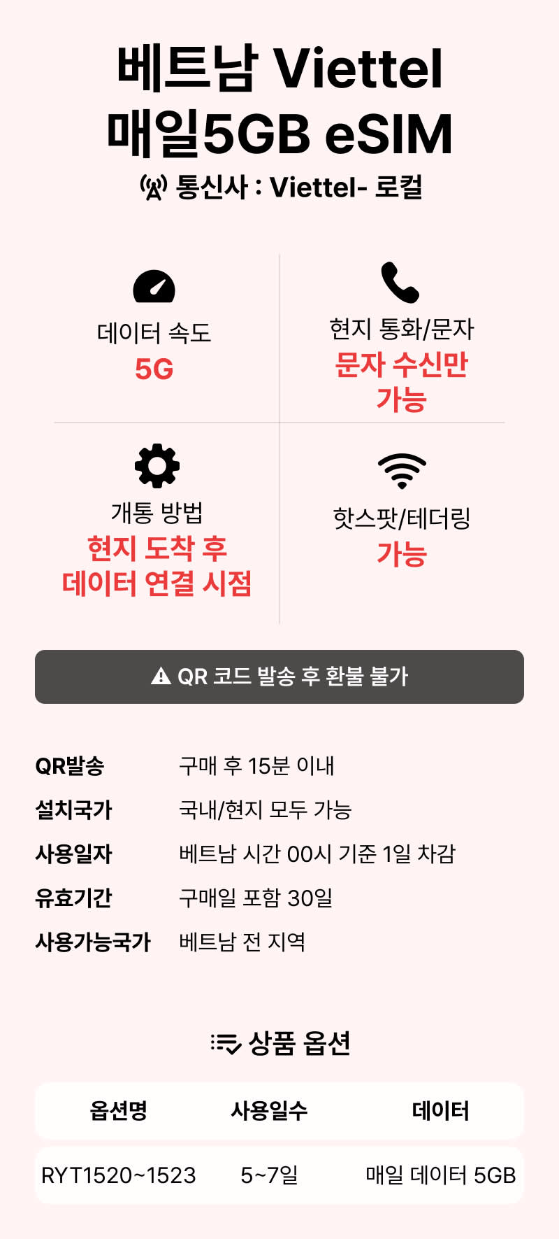 베트남 Viettel 매일 5GB 상품은 QR코드 발송 후 취소가 불가 합니다. 해당 상품은 구매후 최초 발송되는 알림톡 확인후 특이사항 없으시면 해당 알림톡 하단의 QR코드 받기 버튼 누르시면 10분내로 QR코드 알림톡 및 이메일로 발송 됩니다. 베트남 Vinaphone eSIM은 QR코드 스캔하지(eSIM 장착) 않은 상황이면 취소 가능 합니다.