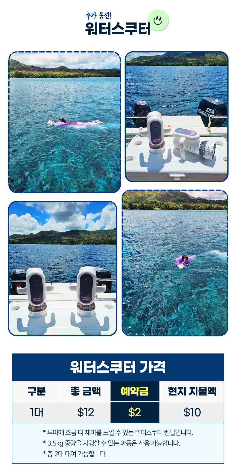 스노클링 + 낚시 + 워터 스쿠터까지 더 알차게 투어를 즐길 수 있어요.