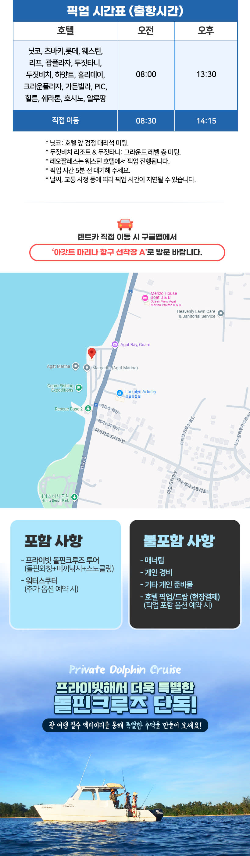 ※ 호텔 픽업 또는 개별 이동 - 픽업 이용 시 픽업 비용 $70 추가(인원 관계 없이 한 예약건당 발생) -> 픽업 요청시 추가기재사항에 기재해주세요! ※ 개별 이동 시: 아갓트 마리나 항구(구글 네비) 선착장 A