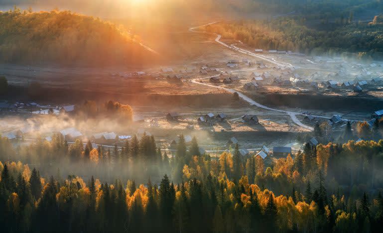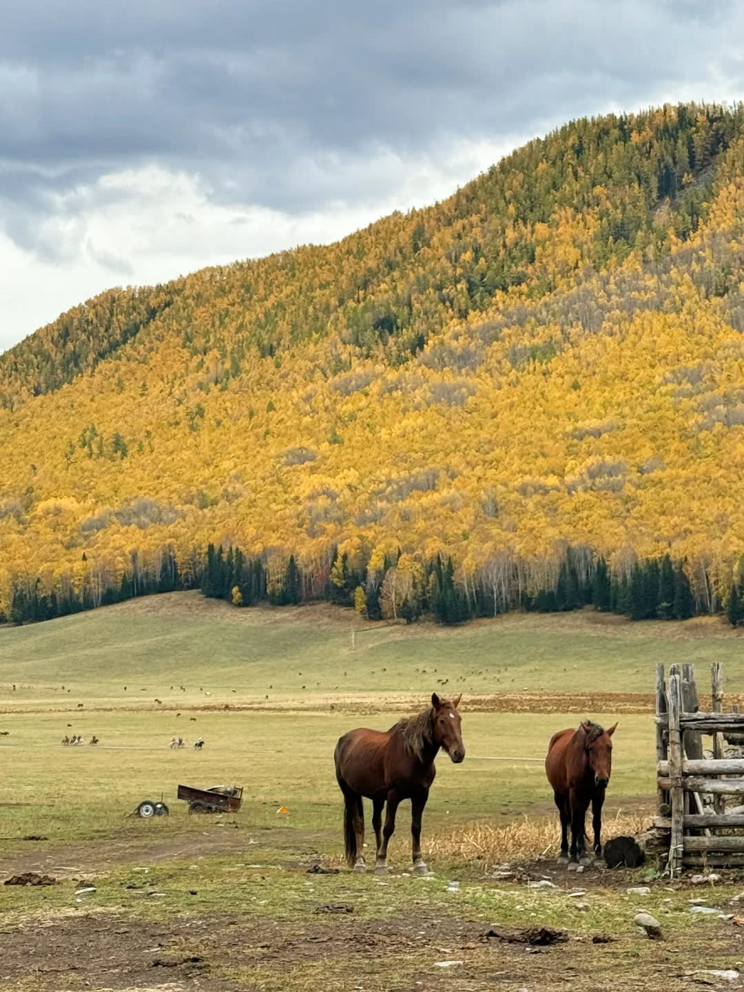 * 먼 산을 바라보며 말을 타고 허무(禾木)의 사계절을 멀리 조망합니다.