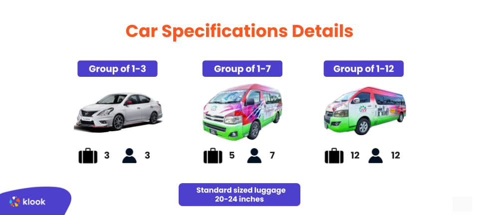 어떤 차종을 사용할 수 있나요? 3가지 특별한 선택지를 만나보세요! 최대 3인 그룹을 위한 스탠다드 세단, 최대 7인 그룹을 위한 스탠다드 밴, 최대 12인 그룹을 위한 스탠다드 밴이 준비되어 있습니다. 인원수와 짐 크기에 맞는 차량을 선택하세요.
