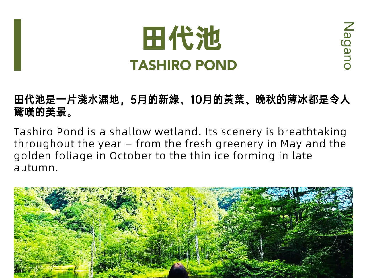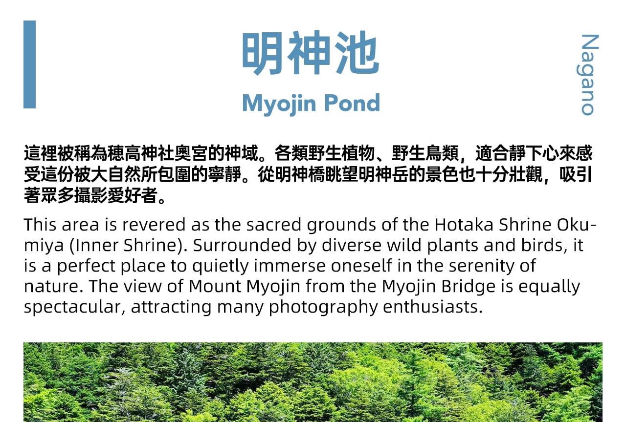 • 💧다이쇼이케 숨겨진 명소: 호수 북동쪽 기슭에서 고사목을 전경으로 삼고 멀리 보이는 푸르른 산림과 맑은 하늘을 배경으로 촬영하면 입체감이 풍부한 깨끗한 사진을 찍을 수 있습니다. 💧다시로이케 숨겨진 명소: 습지 가장자리에 있는 웨스턴 비 기념 전망대에서는 다시로이케 전체와 주변 경관을 조망할 수 있어 전체 풍경을 촬영하기에 좋은 장소입니다. 🌉갓파 다리 숨겨진 명소: 다리 하류에서 아즈사가와 강을 전경으로 삼아 갓파 다리와 주변 경관을 올려다보며 촬영하면 색다른 시각으로 사진을 찍을 수 있습니다. ✨묘진 연못 숨겨진 명소: 오후에 햇빛이 잘 드는 시간대에 호수 물결이 반짝이고 호타카다케 산의 그림자가 뚜렷하게 비쳐 이때 촬영하면 호수의 아름다운 경치를 포착할 수 있습니다. 위는 추천 촬영 장소이며, 실제 촬영 결과는 당일 날씨에 따라 달라질 수 있습니다~~~