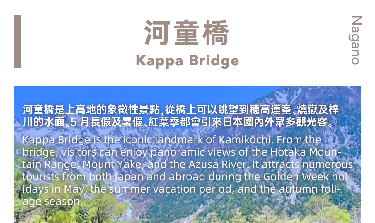 * 갓파 다리 - 가미코치의 상징적인 명소로, 아즈사가와 강을 가로지르며 다리 옆 풍경이 그림처럼 아름다워 사진 촬영에 훌륭한 장소입니다.