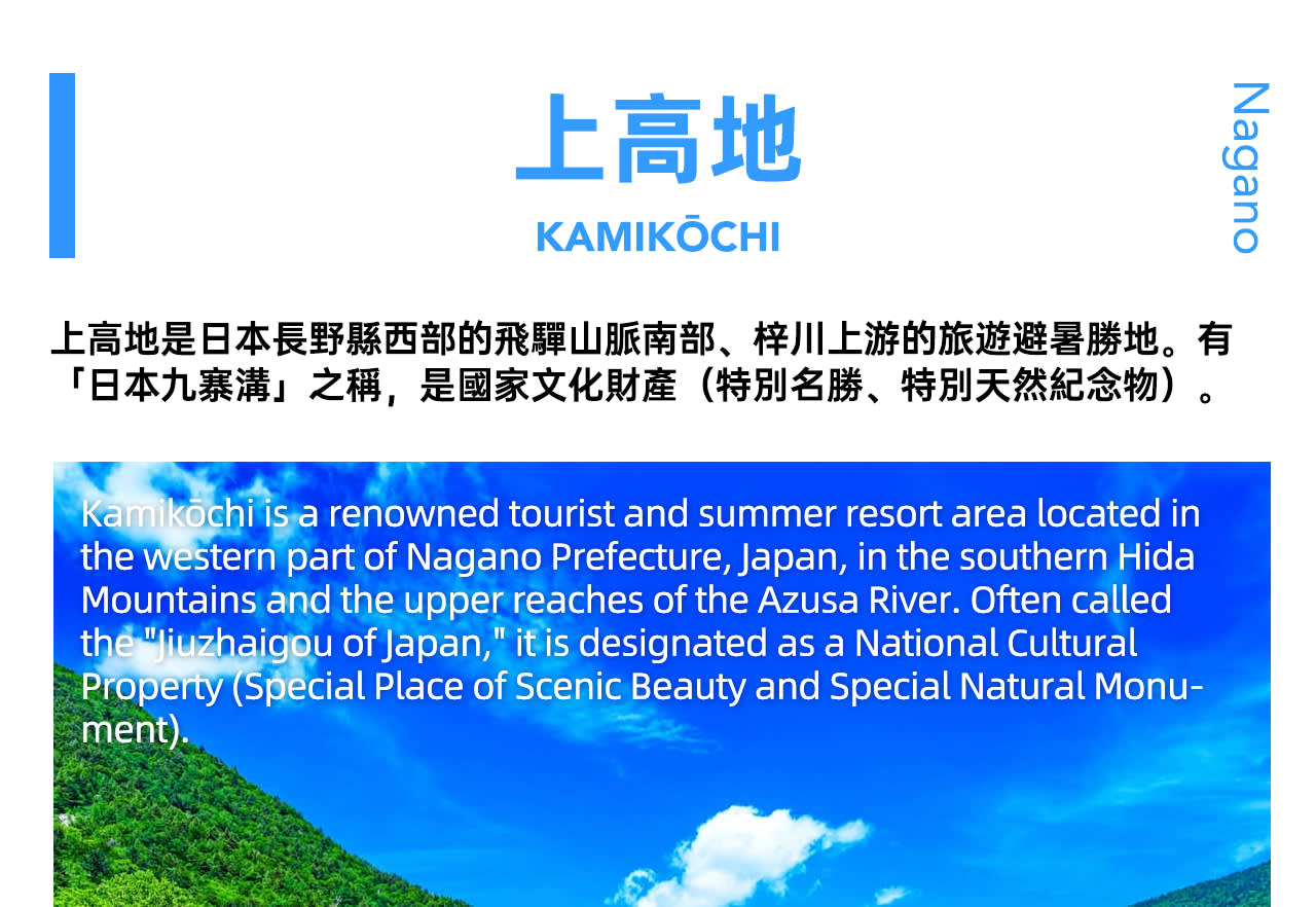 • 나고야에서 출발하여 '일본의 청류 정토 비경'이라고 불리는 가미코치로 직행하여 봄, 여름 한정의 치유 풍경을 만끽하세요! 푸르름이 새롭게 피어나는 가미코치는 도보 산책과 자연의 생기를 담아내기에 더없이 좋은 곳입니다. 따뜻한 바람을 맞으며 이 곳으로 발걸음을 옮겨 아즈사가와 강을 따라 거닐면 맑은 물이 양쪽 기슭의 푸르른 새싹을 비추고 갓파 다리 옆으로는 푸른 숲과 설산이 어우러져 가벼운 산책만으로도 싱그러운 봄, 여름의 아름다운 풍경을 눈에 가득 담을 수 있습니다. 잠시 도시의 소란에서 벗어나 자연과 함께하는 편안함을 되찾을 수 있습니다.