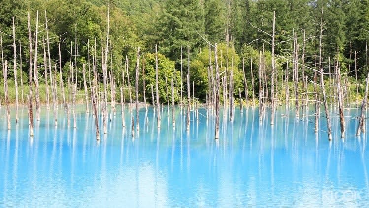 ☆시로가네 푸른 연못의 마법을 경험해 보세요. 코발트 블루 물과 은색 자작나무의 놀라운 대비는 정말 잊을 수 없는 사진 명소 경험을 선사합니다.