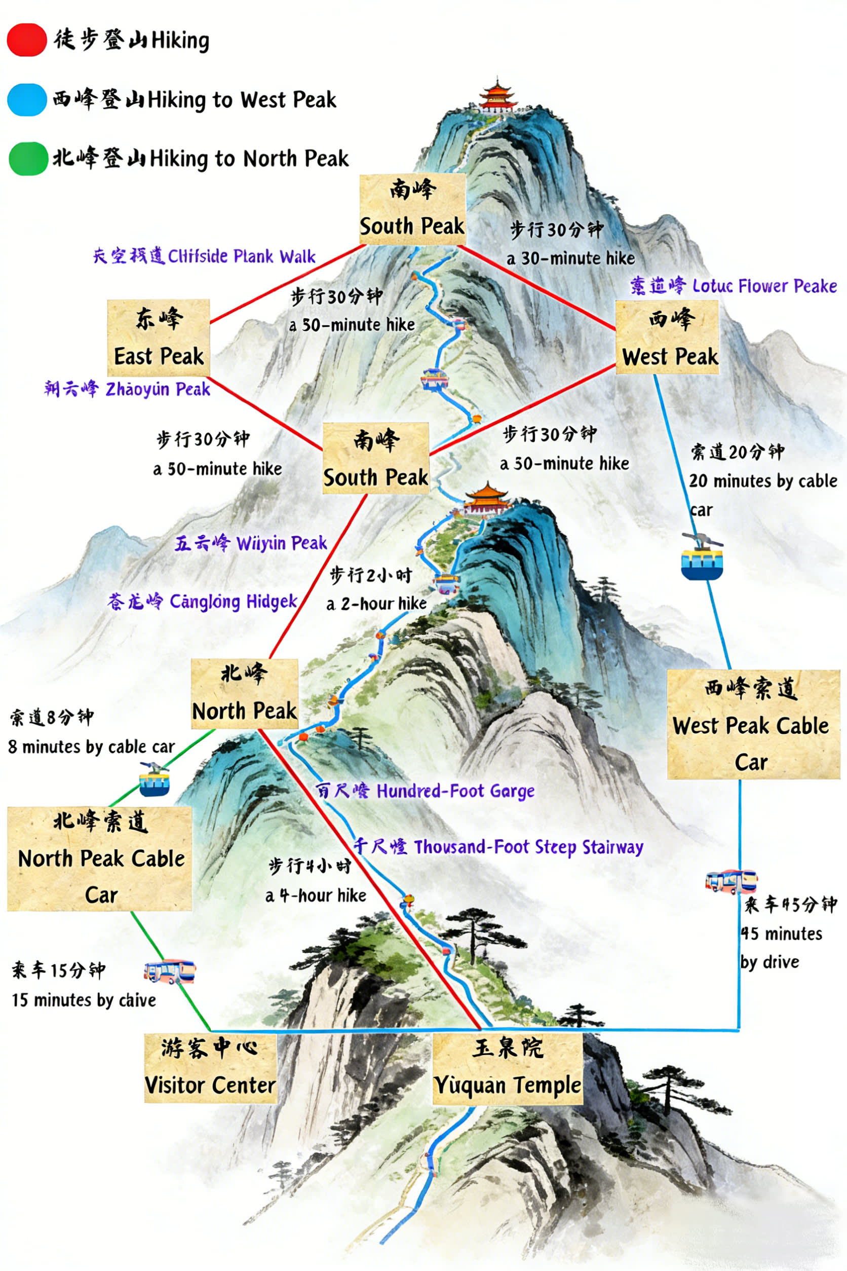 * 여정 코스: 관광객 센터--진산차를 타고 북봉 케이블카 타는 곳으로 이동--케이블카로 산에 오르기--북봉--중봉--서봉--남봉--동봉--중봉--북봉 케이블카로 하산--출산차를 타고 관광객 센터로 이동