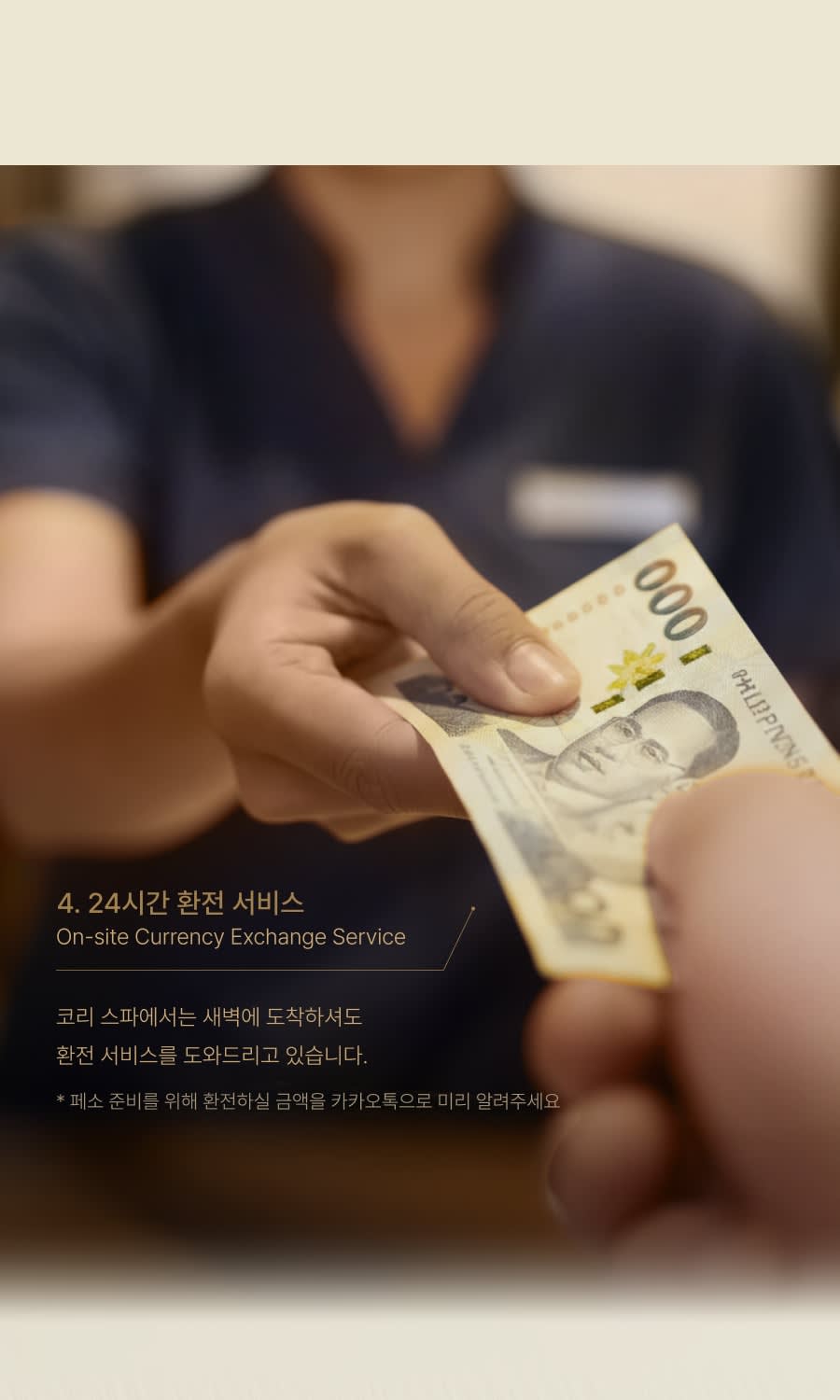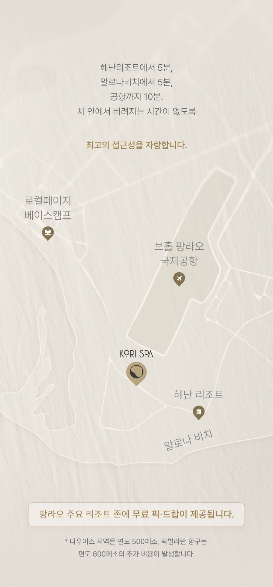 * 팡라오 지역은 무료로 이용 가능하며, 다우이스는 편도 500페소, 타그빌라란 시티 및 항구 지역은 편도 800페소의 비용이 발생합니다. 이 외 지역 이용 문의는 코리스파 고객센터로 문의해주세요. * 마지막 예약 시간은 오후 10시입니다. * 자정 ~ 오전 9시 까지는 첫날팩 고객들의 수면 시간이므로 예약이 어려울 수 있습니다. * 임산부 고객님은 예약 전에 꼭 말씀해주세요. 임산부 마사지 교육을 받은 테라피스트로 배정됩니다. * 아동은 성장 마사지로 진행되며 마사지를 받지 않는 경우, 마사지룸이 아닌 코리스파 내 별도의 휴게공간에서 대기하실 수 있습니다. * 마사지 받기 바로 전 스파로 오시는 경우에만 픽업이 가능, 짐만 픽업은 불가 * 리조트 내 차량 정차 시간이 5분이므로, 픽업 시간 5분 전에는 미리 나와서 대기 해주시길 바랍니다. * 개별 여행자 보험 가입을 권장 드립니다