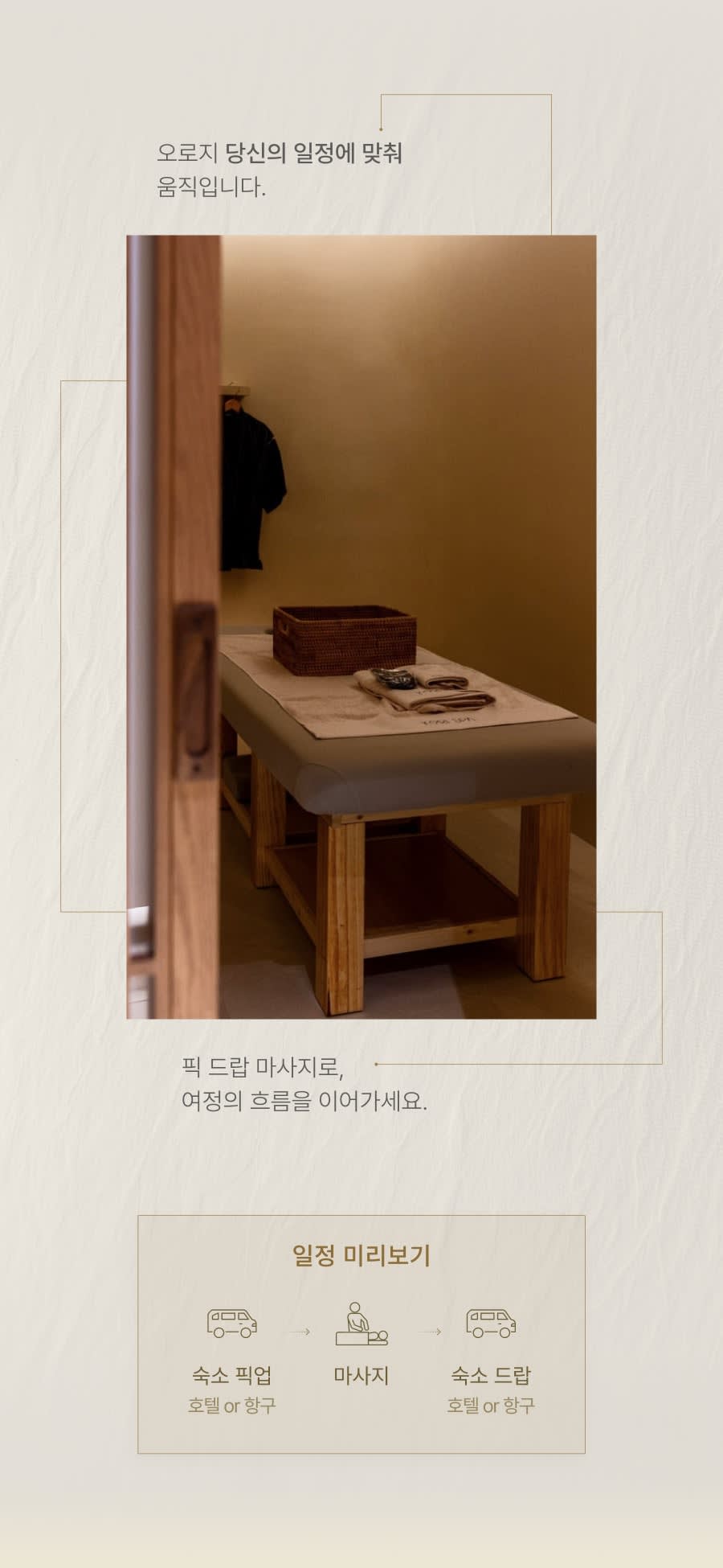 📢 픽업과 드랍 서비스가 포함되어 있어, 걱정 없이 편안하게 마사지 체험에 집중할 수 있습니다.