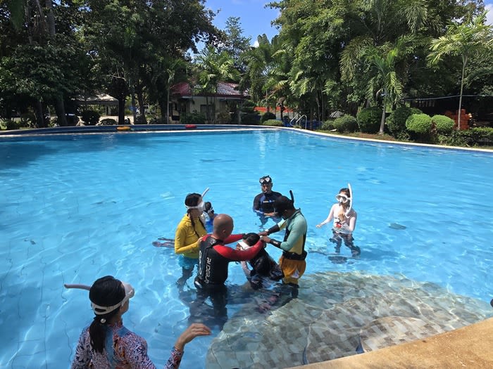 또한 나팔링 프리다이빙 전, 이론교육과 수영장에서 사전교육을 1시간 동안 진행합니다.