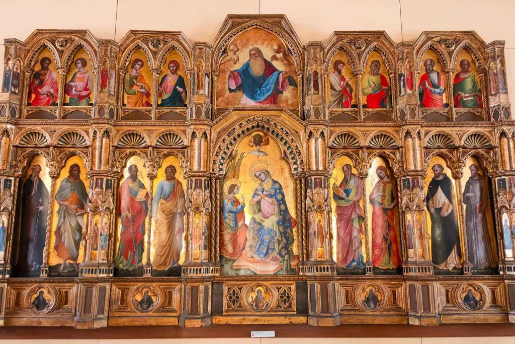 14세기부터 16세기까지의 예술을 고딕 시대부터 시작해 탐험하게 됩니다: 로렌초 베네치아노의 "사자 폴리티코"와 같은 풍부한 색상과 종교적 주제를 특징으로 하는 작품들을 만나게 됩니다. 르네상스로 넘어가는 과정에서 벨리니, 조르지오네, 티치아노의 걸작들은 사실주의, 원근법, 휴머니즘으로의 전환을 보여줍니다.