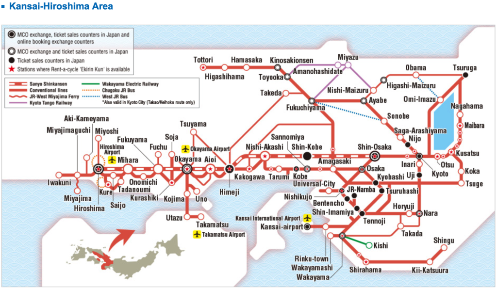 JR 간사이 히로시마 패스로 5일 연속 무제한 현지 JR 기차, 버스, 간사이와 히로시마의 페리, 또한 오카야마, 타카마츠, 키노사키온센, 아마노하시다테, 시라하마, 기이카쓰우라의 지정된 구역 내에서 서비스를 이용할 수 있습니다. 또한 간사이 국제공항과 교토 간 하루카 특급열차를 무제한으로 이용할 수 있는 혜택도 포함되어 있습니다.