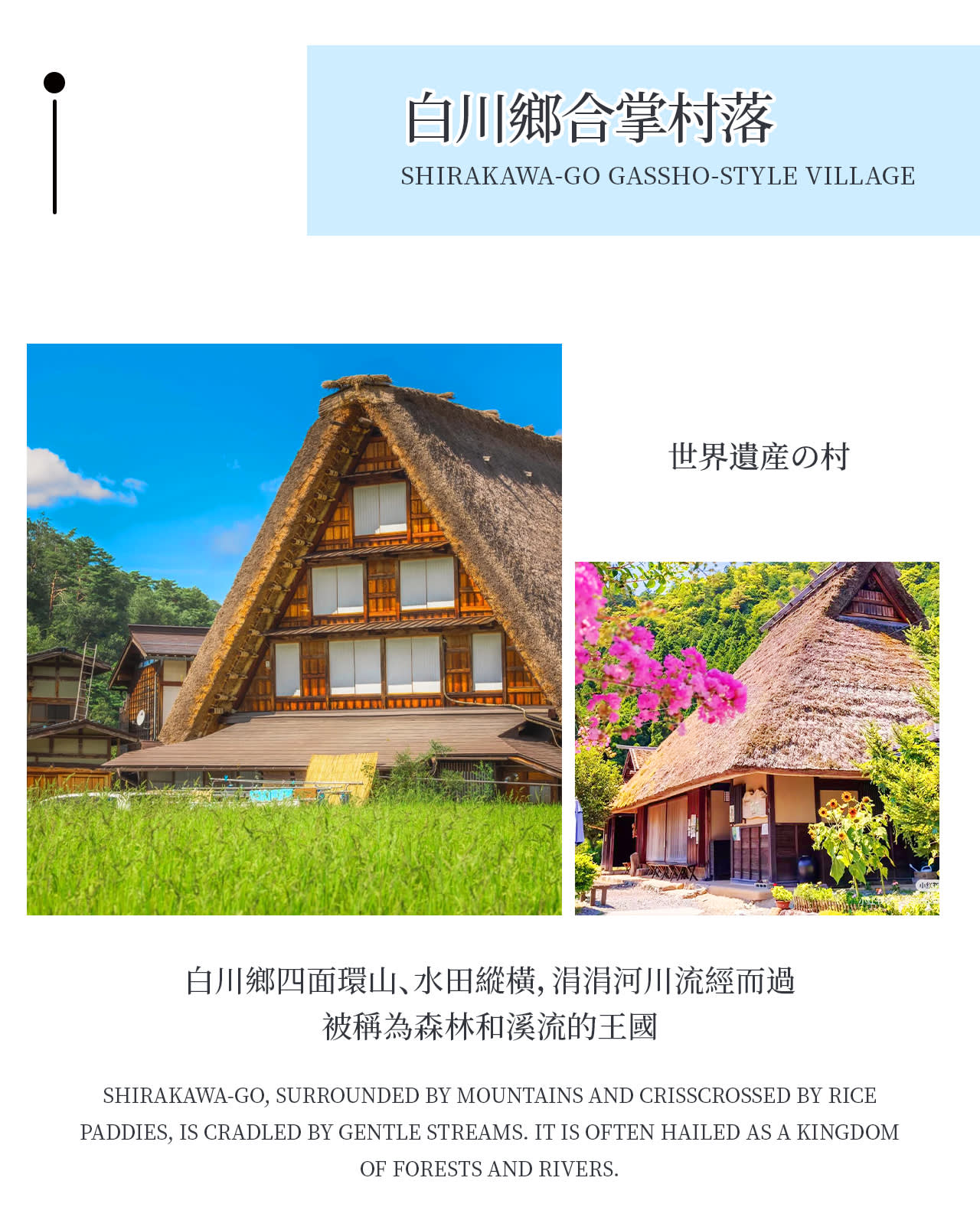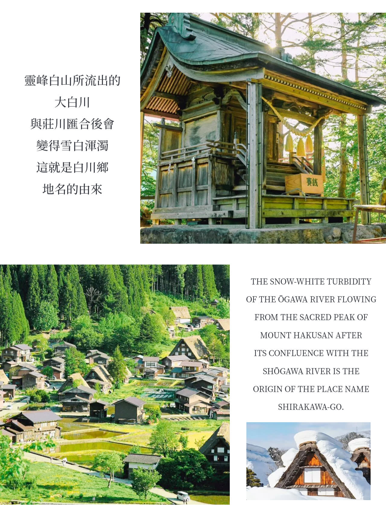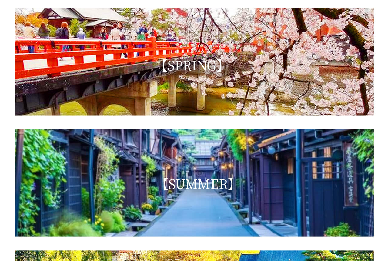 * 동화 속 풍경 같은 갓쇼즈쿠리(합장 구조) 가옥들이 모여 있는 시라카와고 갓쇼마을(세계 문화유산)은 사계절 내내 아름다운 사진을 찍을 수 있는 필수 방문 명소입니다.