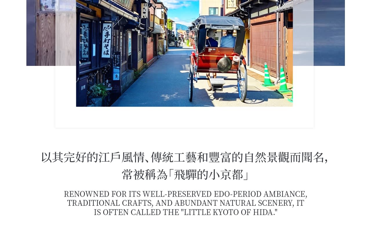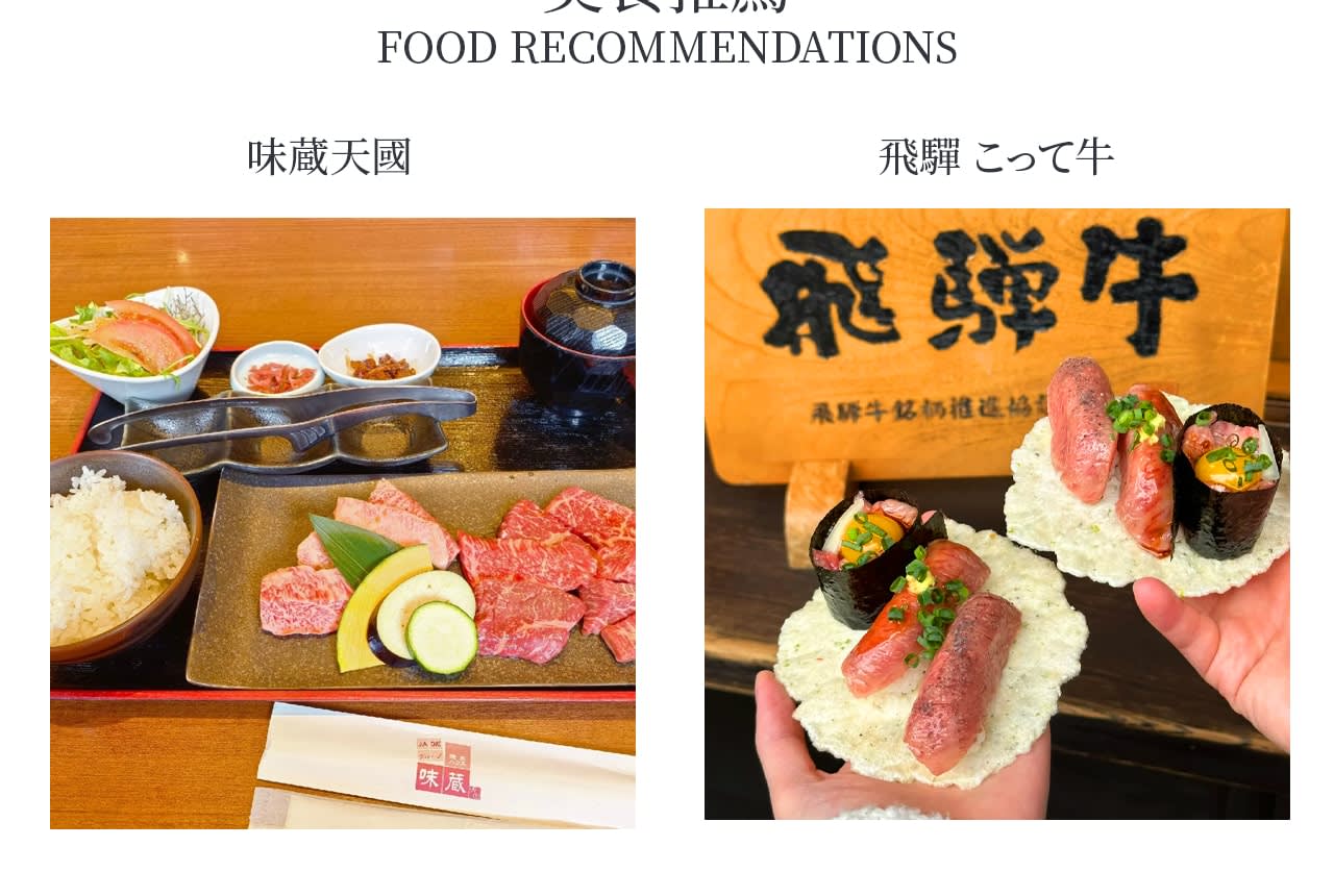 친애하는 친구 여러분, 교통과 환승 걱정 없이 편안하게 여행을 즐기실 수 있도록 인기 명소 세 곳, 군상하치만, 히다 다카야마, 시라카와고 갓쇼무라를 방문하는 여정에 여러분을 초대합니다. 먼저 청류로 둘러싸인 군상하치만에 들러 돌판길을 천천히 걸으며 일본 소도시의 가장 현실적인 일상을 느껴보세요. 다음으로 히다 다카야마 옛 거리로 이동하여 자유롭게 산책하고, 히다규 간식을 맛보고, 전통 상점을 둘러보며 시간을 보내기에 안성맞춤입니다. 마지막으로 세계 문화유산인 시라카와고 갓쇼무라를 방문하여 동화 같은 갓쇼 양식 가옥과 아름다운 자연 경관을 감상하며 누구나 반하게 될 것입니다. 여정은 편안한 리듬으로 진행되며 충분한 체류 시간을 제공하므로 일본을 처음 방문하는 분이든 일본의 원래 풍경을 다시 보고 싶은 분이든 안심하고 가치 있는 여행이 될 것입니다.