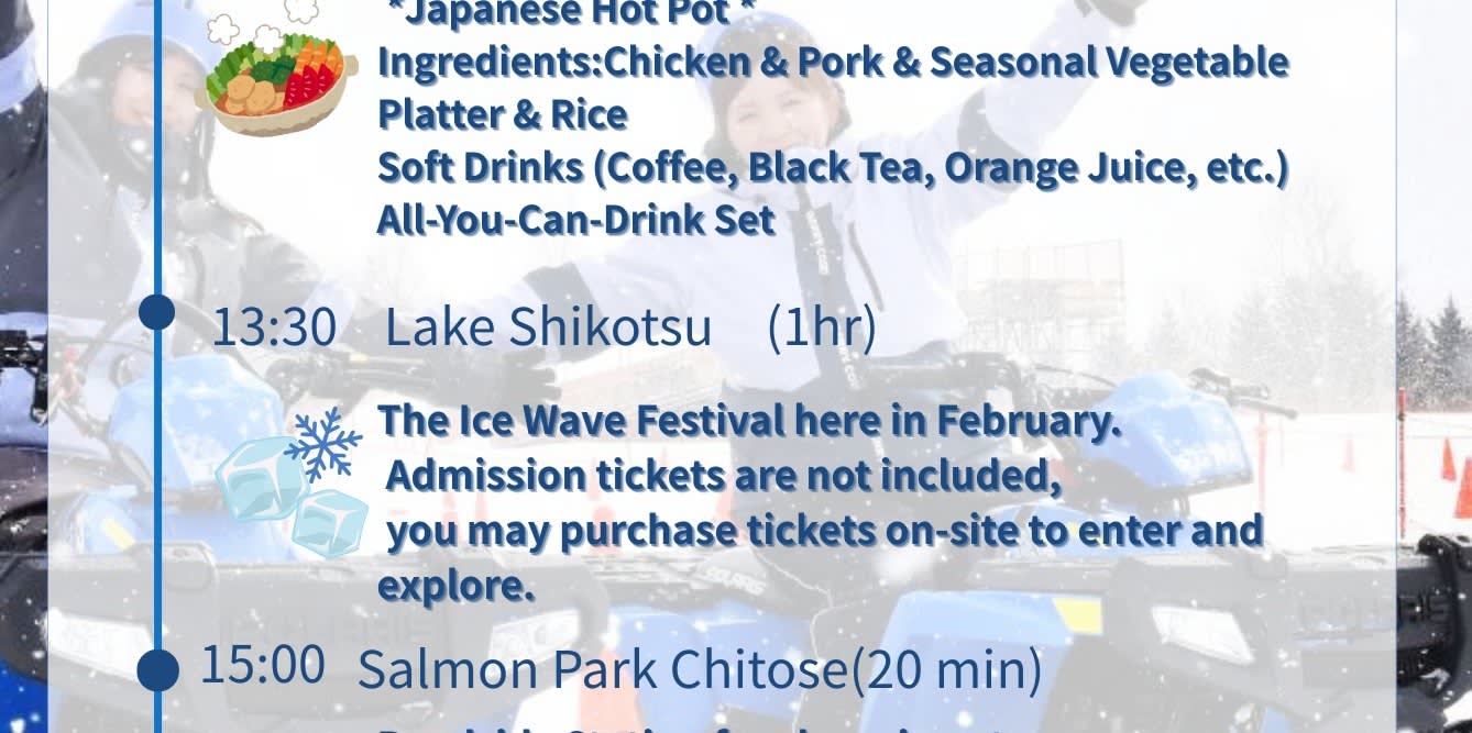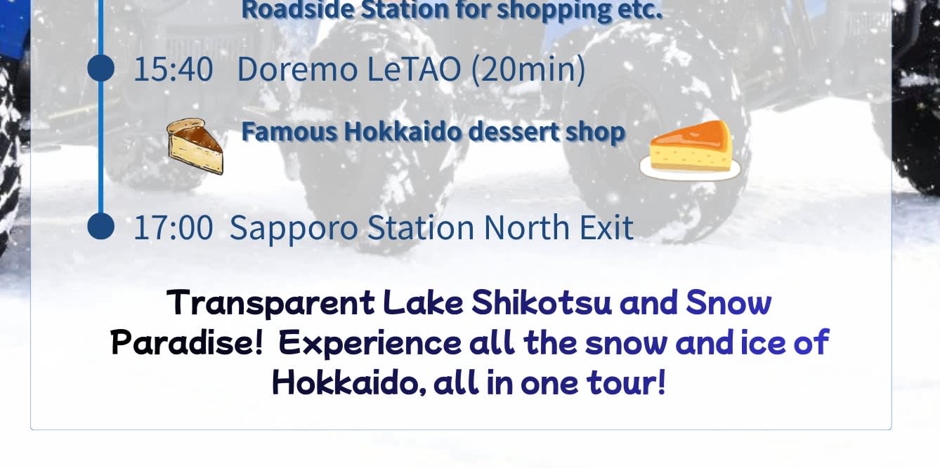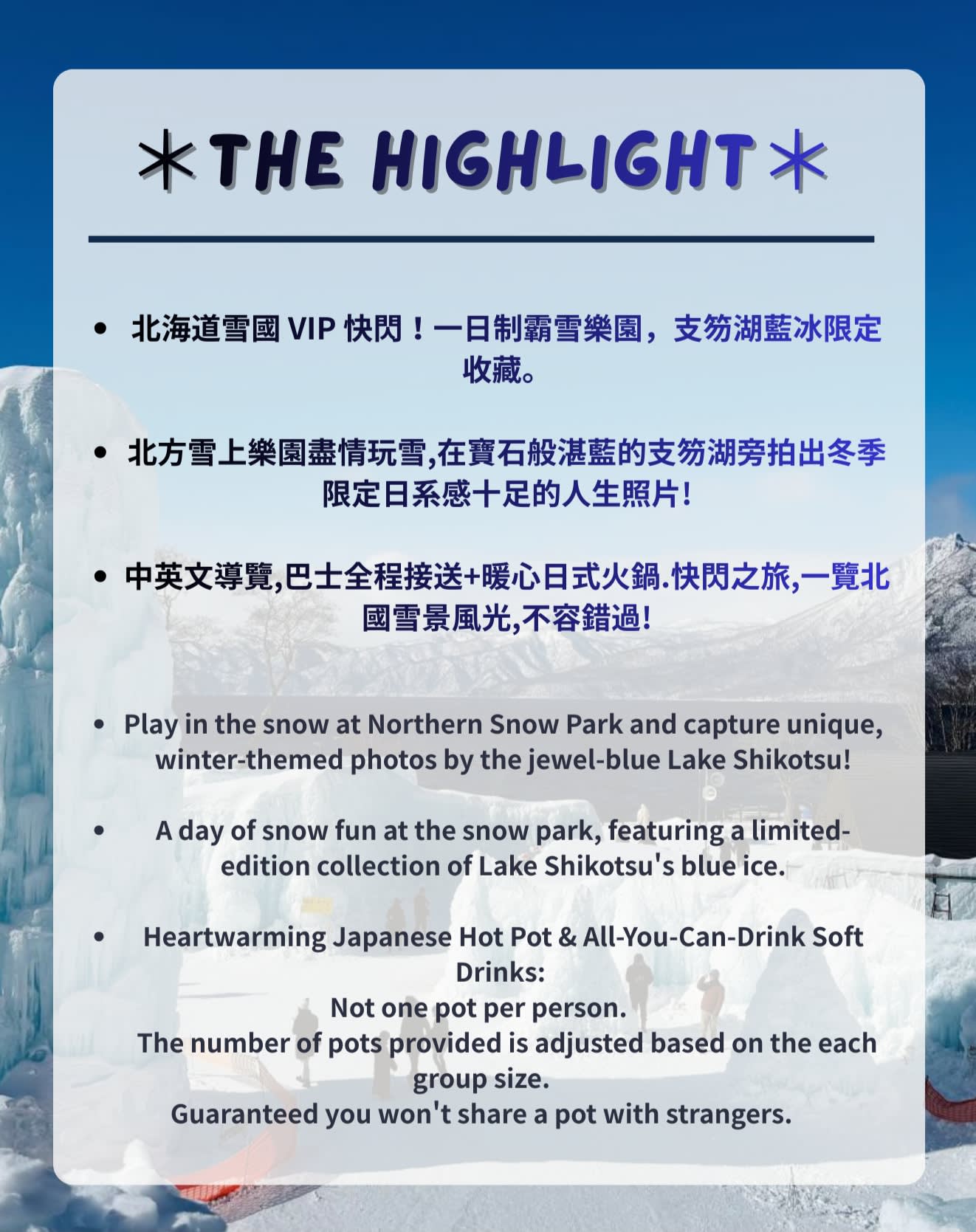 * 시코쓰 호수의 한정판 푸른 얼음 컬렉션을 감상하며 스노우 파크에서 하루 종일 눈놀이를 즐겨보세요.