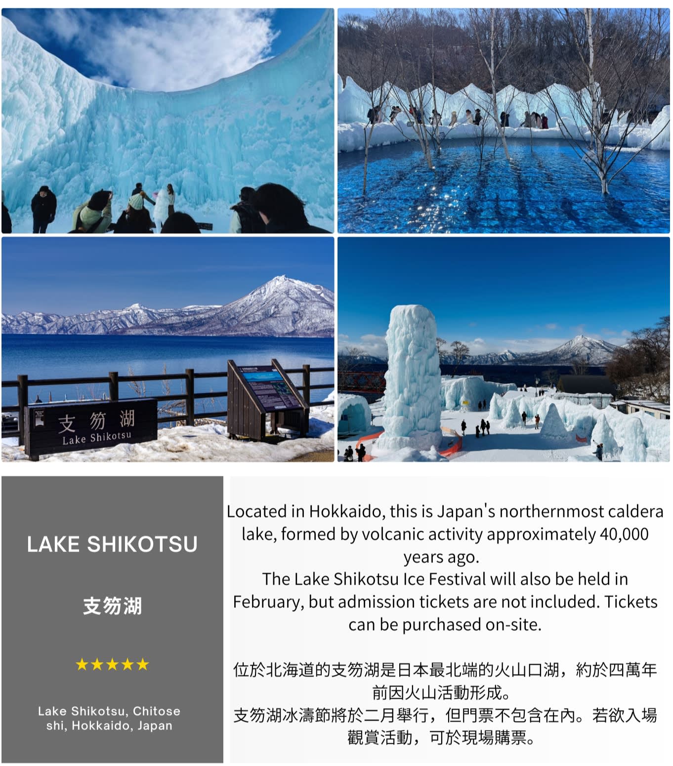 ◆시코쓰호◆ 일본 최북단에 위치한 얼지 않는 호수! 투명하고 독특한 얼음빛 푸른색이 일 년 내내 방문객을 끌어모읍니다. 호수 아래 30미터를 들여다보세요! 눈 덮인 땅에서만 볼 수 있는 푸른 경이로움, "시코쓰호 블루"의 궁극적인 투명함을 경험하세요.