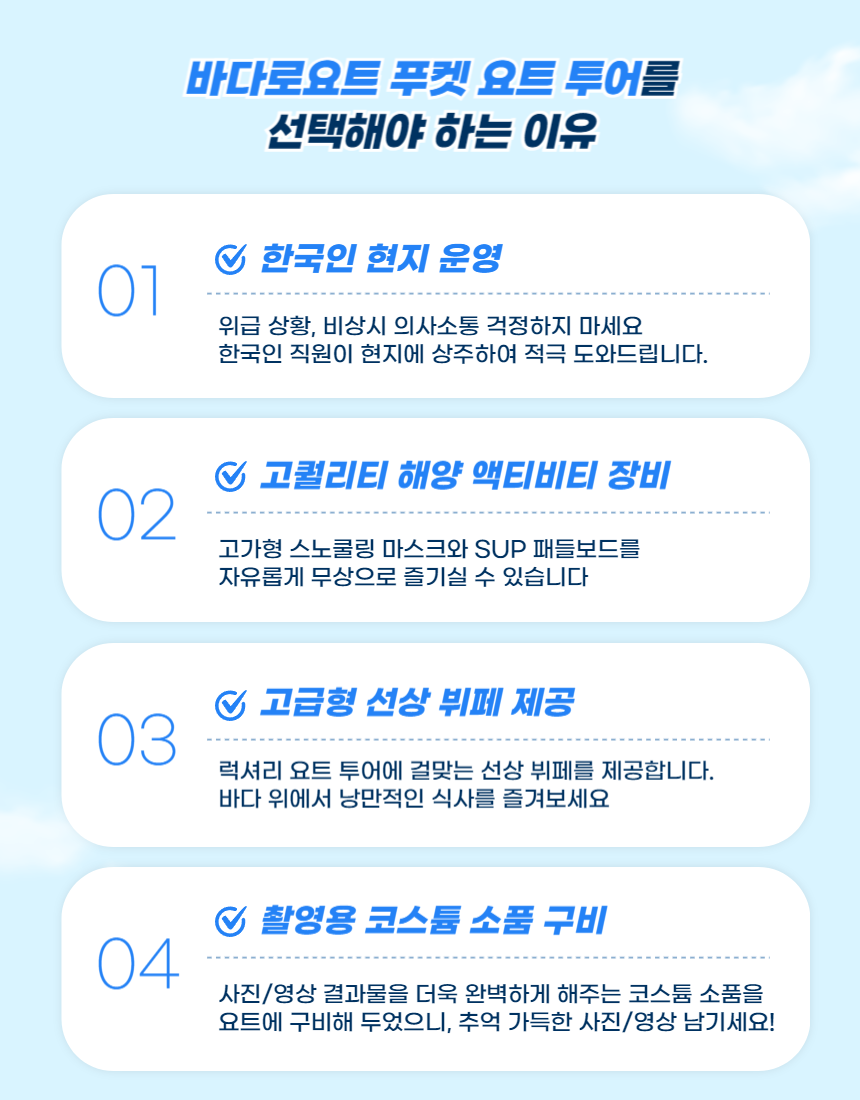 ▶ 주의사항 - 💡 예약 시, 주의사항 보험 가입을 위해 예약 시, 이름, 생년월일, 나이 및 여권 번호를 기재해주셔야 합니다. 유아, 임산부, 노약자 및 신체에 불편함이 있으신 분은 이용이 불가합니다. - 🚐 픽업 안내 까말라, 나카레이, 트리트랑, 카림, 빠통, 카론, 카타, 까투, 라와이, 나이한 지역 호텔 픽업이 포함되어 있습니다. 앞 팀 상황에 따라 15~20분 정도 지연될 수 있어요. 정확한 시간과 비용은 바우처를 꼭 확인해주세요! - ⚠️ 픽업 주의사항 원활한 픽업을 위해 정해진 시간에 꼭 호텔 로비에서 기다려주세요! 로비가 여러 곳인 경우 호텔의 메인 로비에서 기다려주시기 바랍니다. 빌라, 풀빌라, 콘도 (빌라 단지) 메인 입구 및 경비실에서 미팅하시면 됩니다. 미팅 시간에 늦으실 경우 미리 연락을 주셔도 다른 조인된 손님들 때문에 대기할 수 없습니다. 늦으시면 노쇼(No-Show) 처리가 되어 변경, 취소 및 환불이 불가하니 늦지 않게 꼭 미리 도착해주세요. - 📝 외곽 지역 픽업 요청 시, 시내 호텔은 무료 픽업이 가능하나 외곽 지역의 호텔은 추가 픽업비가 발생하거나 가능하지 않을 수도 있습니다. 요청사항 란에 묵으시는 숙소의 이름과 주소를 정확히 기재하여 주시면 픽업불가 또는 픽업추가요금가격을 투어업체에 확인 후 알려드립니다. - ❗ 주의 사항 본인의 부주의로 인한 부상은 책임지지 않습니다. 가지고 오신 귀중품은 호텔에 보관하시는 게 좋습니다. 귀중품 및 현금 등의 분실 사고와 개인의 안전사고에 대하여 각별히 유의해 주시고 이유 불문, 귀중품 분실 시 당사는 책임을 지지 않음을 미리 알려드립니다. 요트 탑승 및 해양 레저 체험 시에는 반드시 구명조끼를 착용해 주시기 바랍니다. - 🎒 준비물 안내 썬크림, 여벌 옷, 모자, 선글라스, 방수팩, 약간의 비상금, 여권(입장시 필요하며, 사본 및 사진 가능) 수영복 (겉옷 안에 미리 입고 오시는게 좋습니다)과 수건, 갈아입을 옷 등을 준비해 오시는 것을 추천드립니다. - 🔸 그 외 안내사항 당일 진행 사정에 따라 시간 및 일정이 변동될 수 있습니다. 직원의 안내 또는 지시를 따르지 않을 경우 투어가 중단되며 이 경우 환불은 불가합니다. 몸이 불편하거나 피곤하거나 투어를 완료할 수 없는 경우 직원에게 먼저 말씀해주시기 바랍니다. 물고기 먹이주기 금지, 산호 수집 금지 (위반 시 태국 내 벌금 및 형사처벌 대상입니다.) 투어 종료 후 요트 선착장에서 바로 푸켓 공항으로 이동을 원하시는 경우, 호텔 픽업 & 공항 샌딩 옵션으로 예약하신 뒤 오픈 채팅창에 요청해 주시기 바랍니다. ※ 공항 샌딩 요청 시 편도 1인당 200바트 추가 요금이 발생합니다. (성인/아동 동일) ▶ 아동 정책 만 4세 ~ 12세 아동은 아동금액이 적용됩니다. 아동 및 청소년은 항상 부모의 보살핌을 받을 수 있도록 주의하시길 바랍니다.