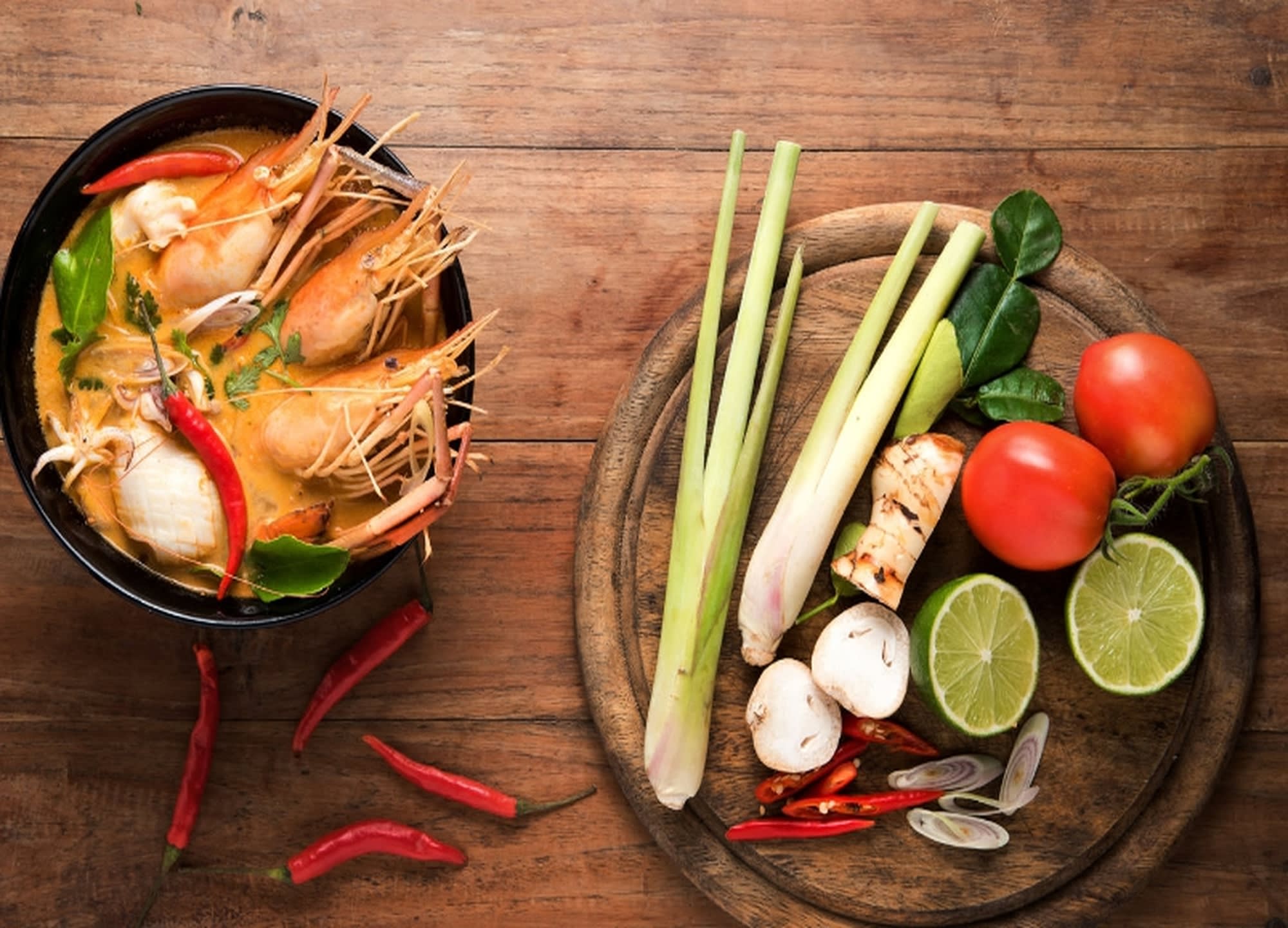 똠얌꿍 (Thai spicy soup with shrimp): 새우와 향신료로 만든 태국의 대표 수프