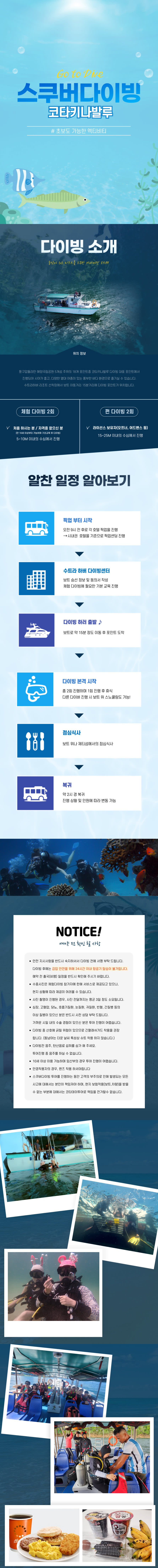 비가와도 진행합니다. 다만 큰 파도와 강한 비로 인해 보트 탑승시간이 지체 될수는 있습니다. (당일 날씨로 인해 보트가 출항되지 못할 시에는 메시지를 통해 안내를 해 드립니다.) 시내권 호텔을 기준으로 픽업 센딩을 해 드립니다. 1)펀다이빙 2회 : 라이선스 보유자(오프너, 어드밴스 등) 15~25M 이내의 수심에서 진행 2)체험 다이빙 2회 : 처음 하시는분 또는 자격증 없으신분, 만10세 이상부터 가능하며 기초교육후 다이빙 합니다. 수심 5~10M에서 진행