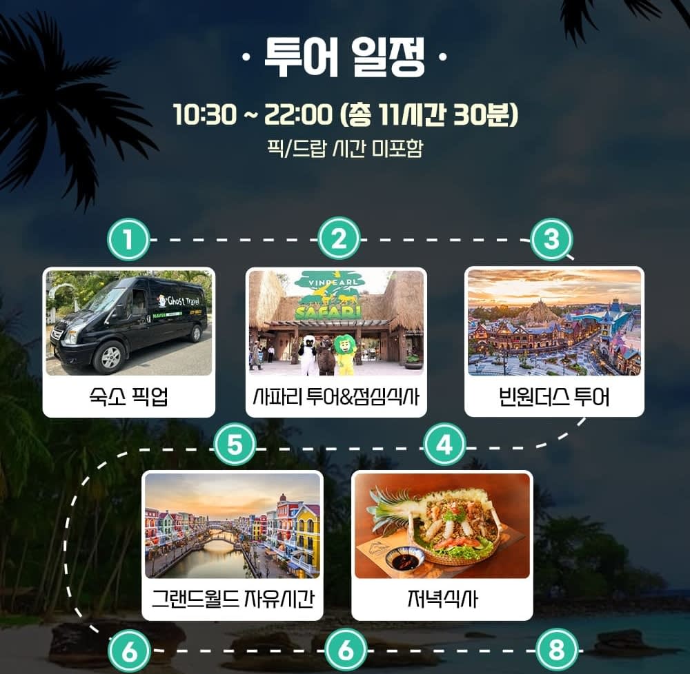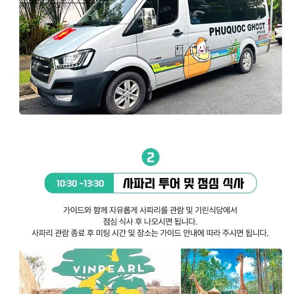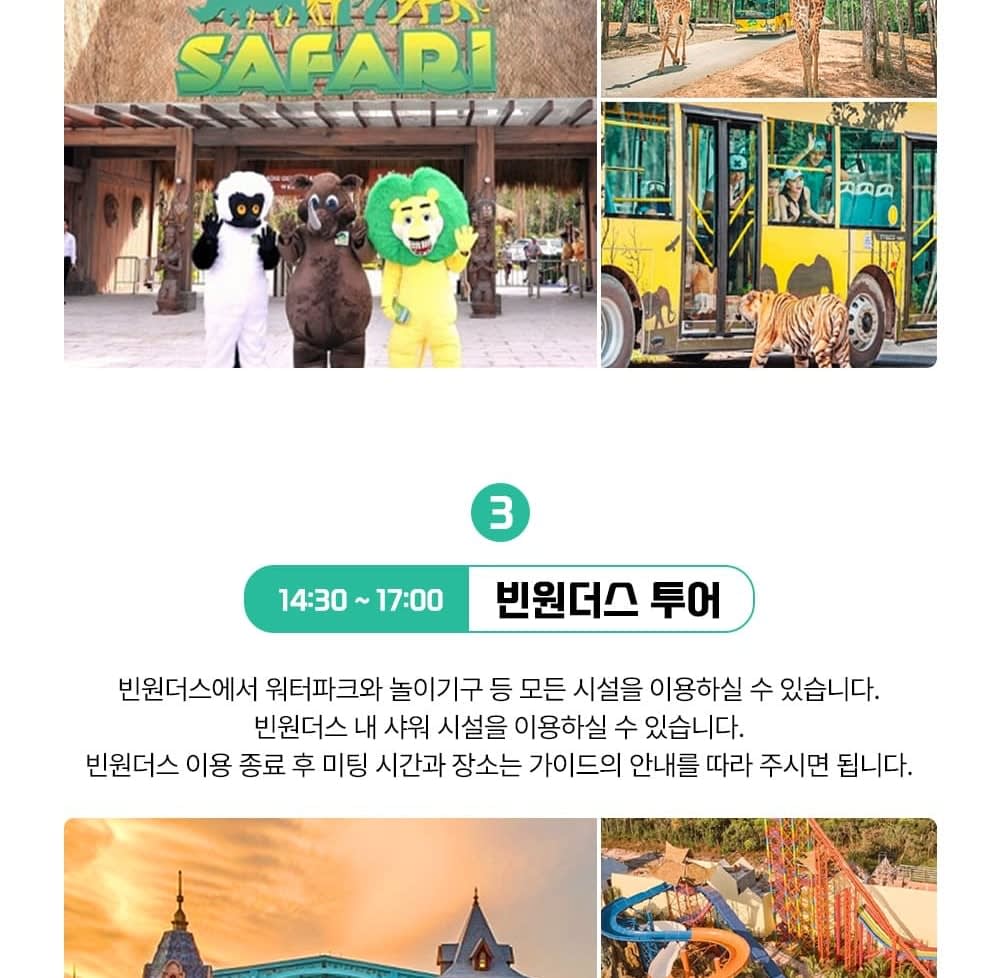 • 09:30 ~ 10:30 🚐 숙소 픽업 (시내/북부 무료) • 10:30 ~ 13:30 사파리 투어 + 점심 식사 • 14:30 ~ 17:00 빈원더스 테마파크 투어 • 17:30 ~ 18:30 저녁 식사 (자유식) • 18:30 ~ 20:00 그랜드월드 자유 시간 • 20:10 ~ 21:00 딘화쇼 관람 • 21:20 ~ 22:00 분수쇼 관람 • 22:00 ~ 이후 🏨 숙소 샌딩