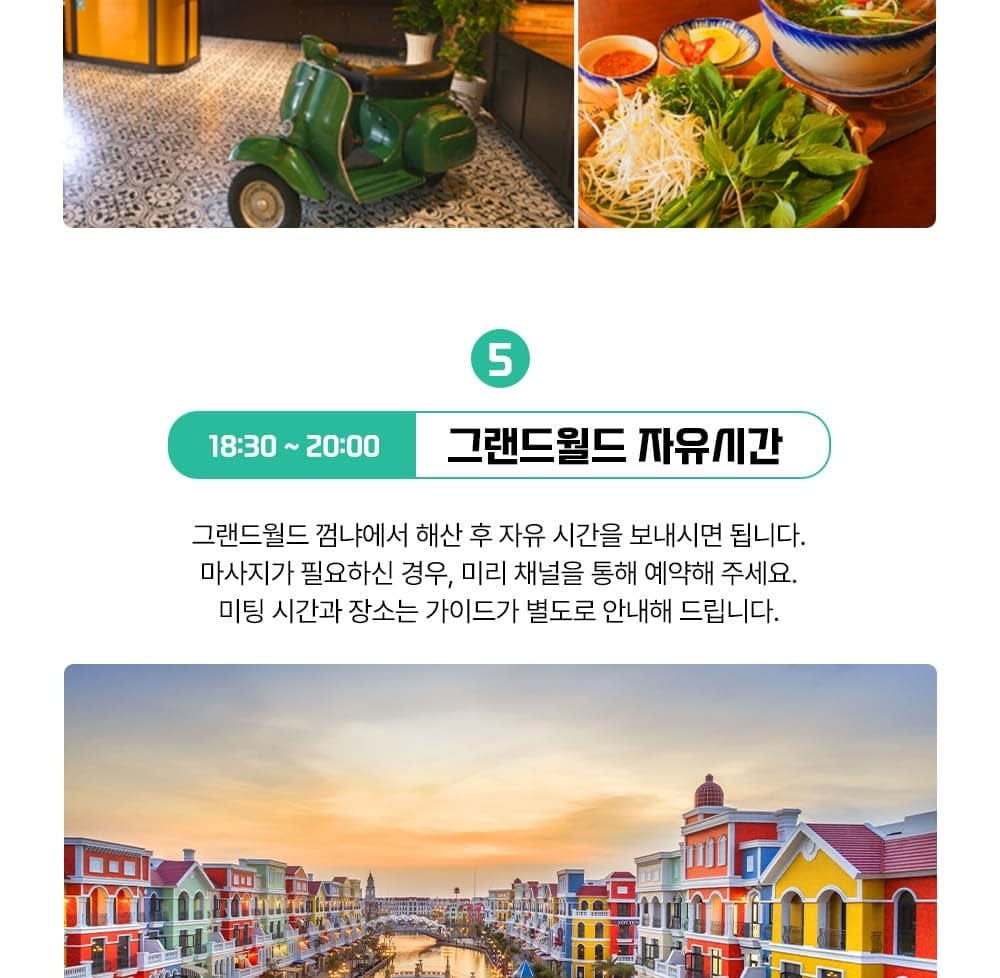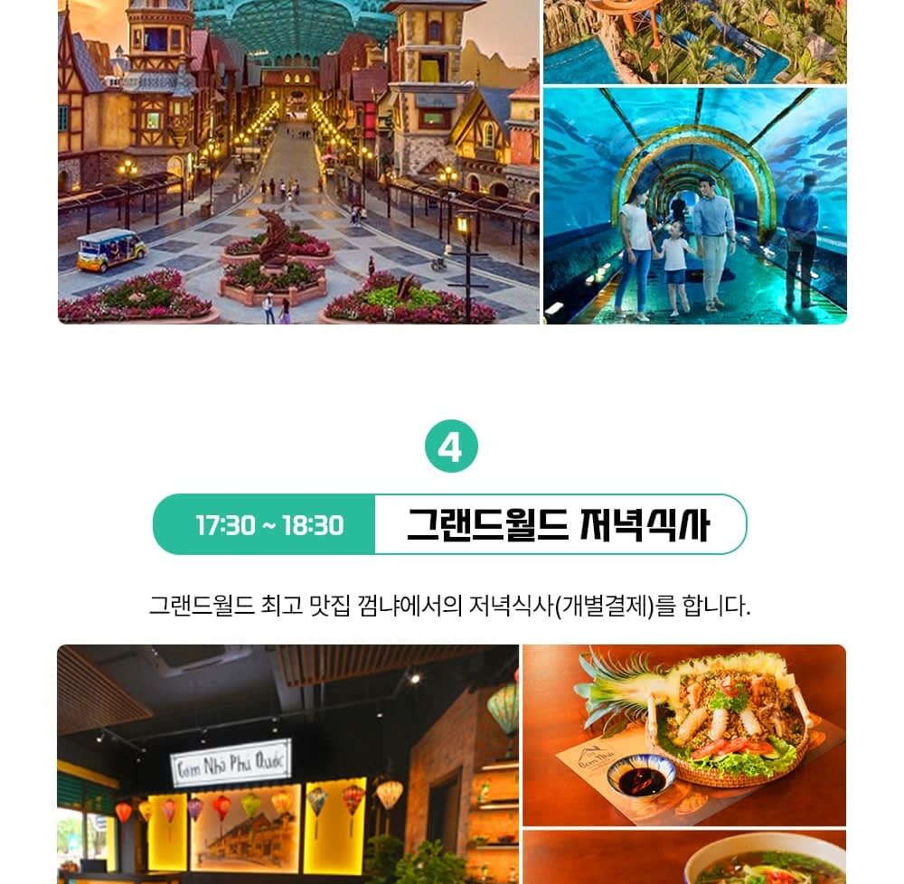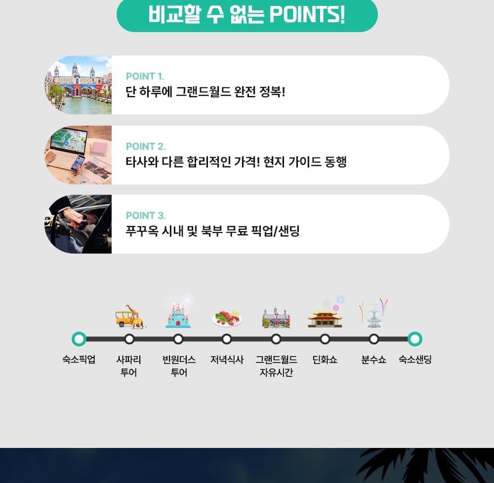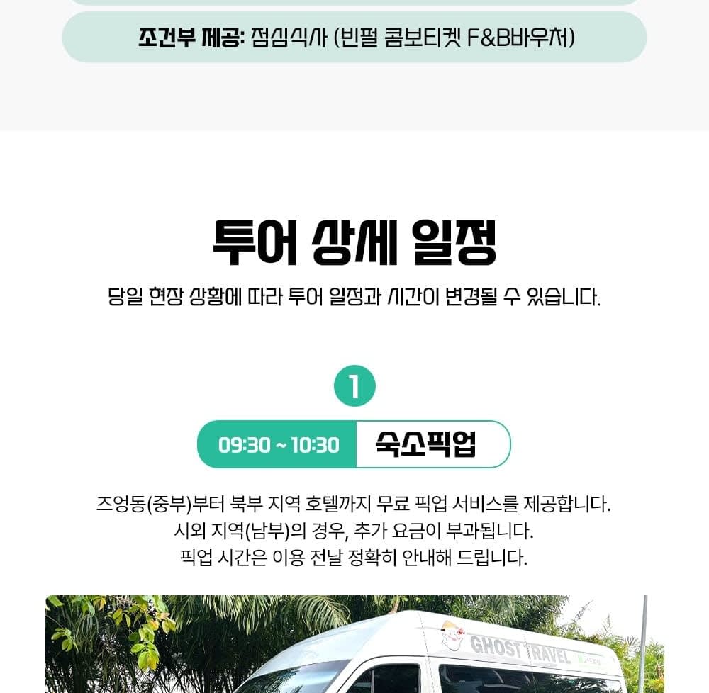 • 09:30 ~ 10:30 🚐 숙소 픽업 (시내/북부 무료) • 10:30 ~ 13:30 사파리 투어 + 점심 식사 • 14:30 ~ 17:00 빈원더스 테마파크 투어 • 17:30 ~ 18:30 저녁 식사 (자유식) • 18:30 ~ 20:00 그랜드월드 자유 시간 • 20:10 ~ 21:00 딘화쇼 관람 • 21:20 ~ 22:00 분수쇼 관람 • 22:00 ~ 이후 🏨 숙소 샌딩