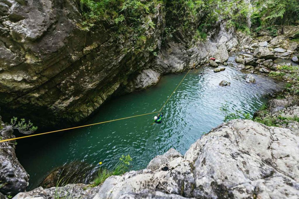 협곡을 탐험하는 동안 여러 수영 지점에서 잠시 멈춰 깊은 웅덩이로 두 번 점프해 보세요. 아드레날린이 솟구치는 스릴을 만끽하며 두 개의 짚라인을 타고 수영장을 가로질러 보세요.