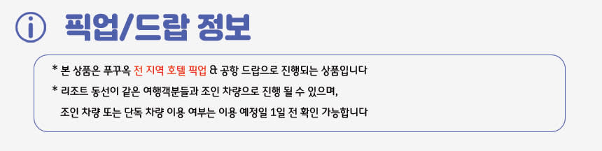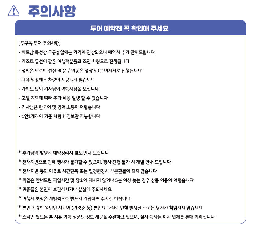 1. 베트남 특성상 하기 국공휴일에는 가격이 인상되오니 예약시 채널 확인 해주세요 2. 상품가의 약 15~30% 가량 인상 예정 (출발 7일전 최종 안내 가능) ✔ 국공휴일 예정 기간 ※ 신정 2025년 1월 1일 ※ 뗏기간 2025년 1월 27일 ~ 2월 2일 ※ 훙왕기념일 2025년 4월 5일 ~ 4월 7일 ※ 노동절 2025년 4월 30일 ~ 5월 4일 ※ 독립기념일 2025년 8월 30일 ~ 9월 2일 ✅ [푸꾸옥 투어 주의사항] - 베트남 특성상 국공휴일에는 가격이 인상되오니 예약시 추가 안내드립니다 - 리조트 동선이 같은 여행객분들과 조인 차량으로 진행됩니다 - 성인은 아로마 전신 90분 / 아동은 성장 90분 마사지로 진행됩니다 - 자유 일정에는 차량이 제공되지 않습니다 - 가이드 없이 기사님이 여행자님을 모십니다 - 호텔 지역에 따라 추가 비용 발생 할 수 있습니다 - 기사님은 한국어 및 영어 소통이 어렵습니다 - 1인1캐리어 기준 차량내 짐보관 가능합니다