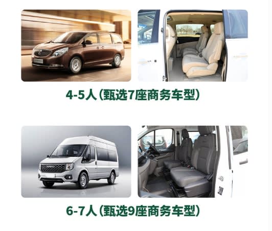 인원수에 따라 다른 차량 패키지를 선택하십시오. 차량 상세 정보 5인승 차량 차량 브랜드: 5인승 이코노미 - 폭스바겐, 传奇 또는 동급; 5인승 컴포트 - 홍치, 파사트 또는 동급; 또는 동급 7인승 차량 차량 브랜드: 7인승 이코노미 - 大通, 全顺 또는 동급; 7인승 컴포트 - 뷰익 GL8 또는 동급; 또는 동급 9인승 차량 차량 브랜드: 포드 全顺 또는 동급