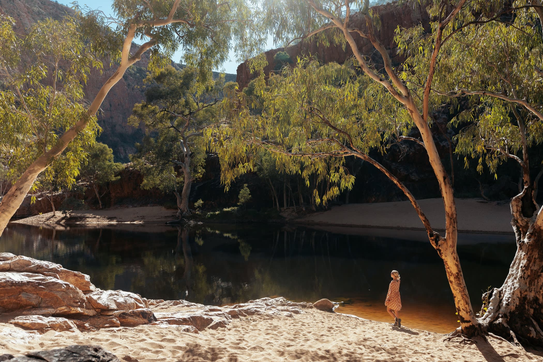 * 우뚝 솟은 절벽과 고요한 물로 둘러싸인 오미스톤 협곡 (Ormiston Gorge, Kwartatuma)에서 수영하며 활력을 되찾으세요.