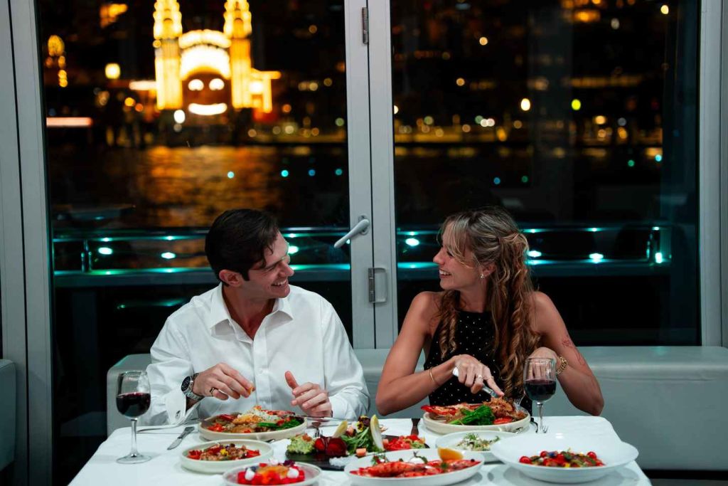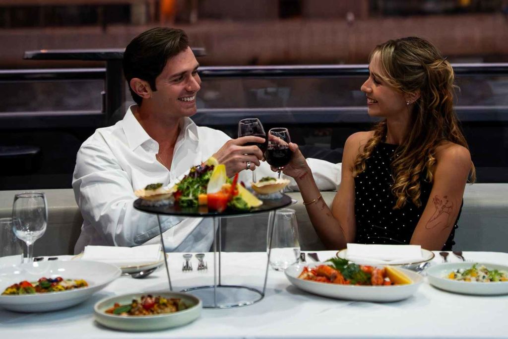 탑승 후, 크루즈 디렉터가 메인 데크의 예약 테이블로 안내해 드립니다. 바닥부터 천장까지 이어진 창문을 통해 최고의 관측 장소를 즐기실 수 있습니다. 메인 코스를 선택한 후에는 스카이 데크로 이동하여 어두운 항구 물결을 배경으로 빛나는 스카이라인을 감상하세요.