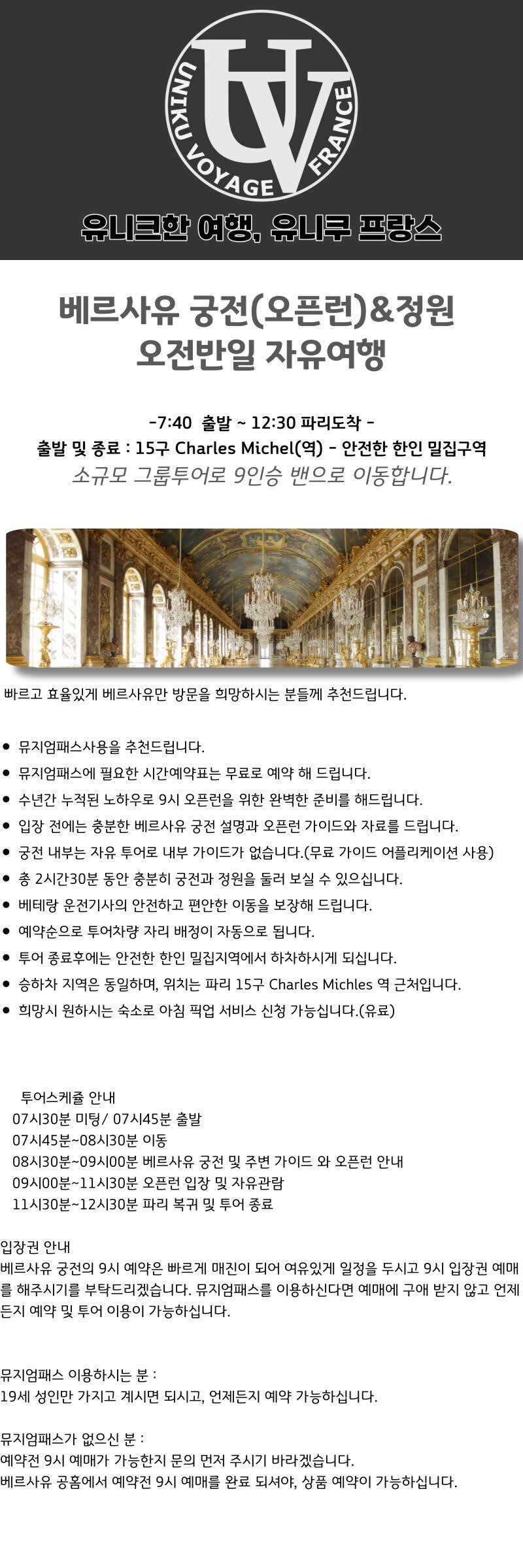 💡 잔여석 조회 안내 - 실예약이 확정 가능한지 주소(https://bit.ly/uniku-voyage-places)를 복사하여 브라우저에 붙여넣기 하시면 엑셀 파일로 잔여석을 조회 및 확인 하실 수 있습니다. 잔여석이 없는 날은 예약하셔도 확정이 안 됩니다. 잔여석 확 - 투어 상품 예약하신 순서대로 투어 차량의 자리 선택이 가능하므로 예약을 일찍 하실수록 유리하십니다. 🔎 상품 안내 - 본상품은 궁전, 내부 가이드가 없는 자유여행 상품입니다. - 입장전까지 함께 이동하며, 궁전 설명과 관람 팁을 드리고 있으며, 투어를 위한 예약 준비와 파리에서 베르사유 궁전 왕복 요금이 포함되어 있는 상품입니다. - 자유도가 높아 오히려 사진찍기 좋아하시거나 불필요한 단체이동이 없어 충분히 장소를 즐기시는 데에 불편함이 없으십니다. ☝️ 꼭 알아두세요 [카카오톡 연결 안내] - 투어 확정이 된 고객님들께는 투어를 위한 모든 연락 및 안내는 카카오톡으로 드리고 있습니다. - 만일 고객님 카톡 계정에 연락처로의 카톡 등록이 안 되게 설정이 되어 있으시다면 연결이 안 되어 메시지 드리기가 어렵습니다. - 고객님 카카오톡에서 전화번호로 친구 추가 옵션이 활성이 되어있는 확인 부탁드리고 전화번호로 친구 추가 옵션 활성을 원치 않으시다면 고객님 카카오톡 아이디 기재 부탁드리겠습니다. 1. 전화번호로 친구 추가 허용 활성 방법 - "전화번호로 친구 추가 허용"을 켜주시면 감사하겠습니다 - 방법 : 카톡 하단 친구에서 상단 톱니바퀴 클릭 -> 친구 관리 ->전화번호로 친구 추가 허용 활성 2. 내 카카오톡 아이디 확인 방법 - 친구 탭에서 상단에 친구 추가(중간) 클릭 -> 카카오톡 id 클릭 -> 내 아이디 확인 [차량 안내] - 만 11세 이하 어린이는 자동차 법률상 "카시트"를 이용해야 합니다. 예약하실 때 카시트 필요하신지 여부 꼭 알려주시기를 바랍니다. - 36개월 미만의 아동은 투어 참여가 불가능 합니다. (유모차 싣을 공간이 없고, 아동용 특수 카시트가 준비되어 있지 않습니다.) - 운전자들의 평균 무사고 경력은 10년 이상이지만, 개별 여행자 보험 가입을 권장해 드립니다. (유럽에서의 차량 보험은 한국의 보험과 많이 달라, 보장 및 보상의 폭이 좁거나 약합니다) - 투어 일정은 현지 사정에 따라 불가피하게 변경되거나 지연될 수 있습니다. - 최소 모객 인원 미만 모객 시 투어가 취소될 수 있습니다. - 그전까지 일정 변경이 가능하신지 여쭤봐서 최대한 출발이 가능하시도록 준비하게 됩니다만, - 최소 출발 모객이 되지 않을 시 최대 사흘 전까지 대기했다가, 투어가 취소될 수 있으며 전액 환불입니다. - 차량별 출발 최소인원은 4명 입니다. - 운행은 9인승 밴으로 운영되며 차량당 최대 투어 인원은 8명입니다. [미팅 안내] - 지각하시는 경우 투어 이용이 어려울 수 있습니다. - 출발 시간 시간에 맞춰 투어가 시작되며, 미도착자에 대한 개별 연락은 진행되지 않습니다. - 짐칸 및 별도의 공간이 없어 캐리어 등 큰 짐들은 도난의 위험과 보관 장소가 없어 같이 여행이 안 됩니다. - 미팅 포인트 외에 숙소로의 픽업 및 샌딩은 투어 요금에 포함되어 있지 않습니다. - 투어 상품 기준 오전 출발은 픽업만, 오후 출발은 샌딩만 신청할 수 있으십니다. [요금 안내] - 숙소 픽업 및 샌딩은 투어 요금에 포함되어 있지 않습니다. - 베르사유 단일 투어는 픽업만 신청할 수 있으십니다. [(인원 관계 없이) 장소당 편도 요금] 픽업 및 샌딩 가능지역(파리 시내, 6,7,14,15,16,17구) - 에펠탑 부근 30 ~ 40€ - 개선문 부근 30 ~ 50€ - 몽파르나스 부근 40 ~ 50€ - 오르세 부근 60 ~ 80€ - 그 외 장소는 시간 관계상 픽업이 불가능합니다. ※ 파리 1~4구는 2025년부터 공기오염 특별구역으로 지정되어 택시 (우버,볼트 포함),거주자 외에는 구간 통과가 어렵습니다. 따라서 루브르, 마래, 레알쪽에 계시는 분은 픽업 이용이 안 되시고 우버나, 볼트 이용하셔서 이동해 주시면 감사하겠습니다. ※ 픽업을 위해 왕복 거리를 이동해야 해서 가격이 우버나 볼트에 비해 가격이 합리적이지 않습니다.