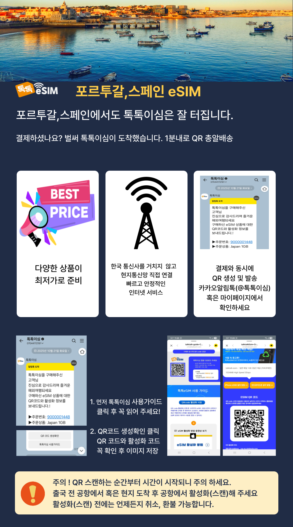 구매한 eSIM을 QR코드 스캔(활성화)하면 취소/환불이 불가합니다. QR코드 스캔(활성화)한 시점부터 시간이 시작되니 공항에서 출발전 스캔(활성화 )하길 권장합니다. 톡톡이심 앱을 이용하면 실시간 데이터 사용량을 확인할 수 있습니다. 데이터 부족시 앱에서 바로 구매할 수 있습니다. 톡톡이심 앱에서 실시간 쌍방향 통역서비스를 무료로 이용할 수 있습니다.