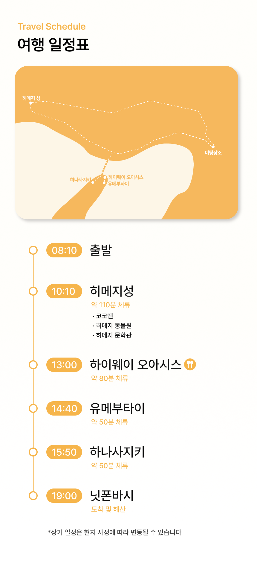 02 미팅 안내사항 미팅 시간 : 오전 8시 00분 ~ 8시 10분까지 * 당일 미팅 시간에 늦으시는 경우, 노쇼로 간주되는 점 양해 부탁 드립니다. * 미팅 시, [예약자 성함] 또는 [핸드폰번호 뒤 4자리]를 말씀해주시면 탑승을 도와드립니다. * 배차 마감일은 최소 모객 여부와 관계없이 예약이 어렵습니다.