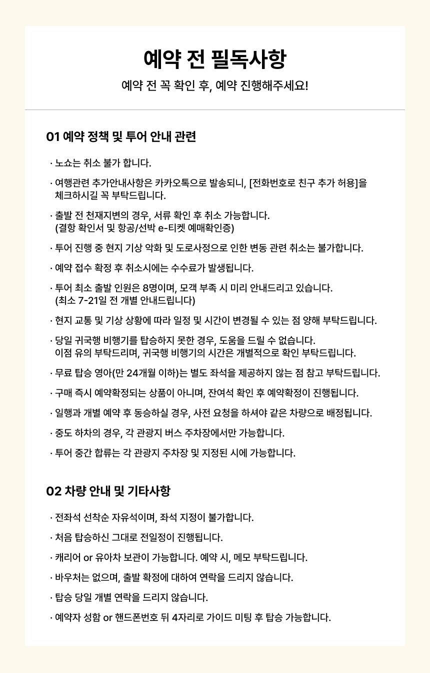 01 사전 체크 * 개별 여행자 보험 가입을 권장 드립니다. * 캐리어 또는 유아차가 있는 경우, 메모 남겨주세요.(트렁크 보관만 가능) * 배차 마감일은 최소 모객 여부와 관계없이 예약이 어렵습니다. * 버스 좌석은 지정석이 아닌 전좌석 선착순 자유 승차임을 확인 부탁 드립니다. * 현지 교통 상황 및 현지 사정의 따라 투어 시간이 조정 될 수 있습니다. * 카시트는 제공되지 않으며, 설치가 어렵습니다. 이점 양해 부탁드립니다. * 여행 확정이 되어도 최소 모객인원 미만일 경우, 투어가 취소될 수 있습니다.(출발일로부터 7일~14일 전 확인 가능)