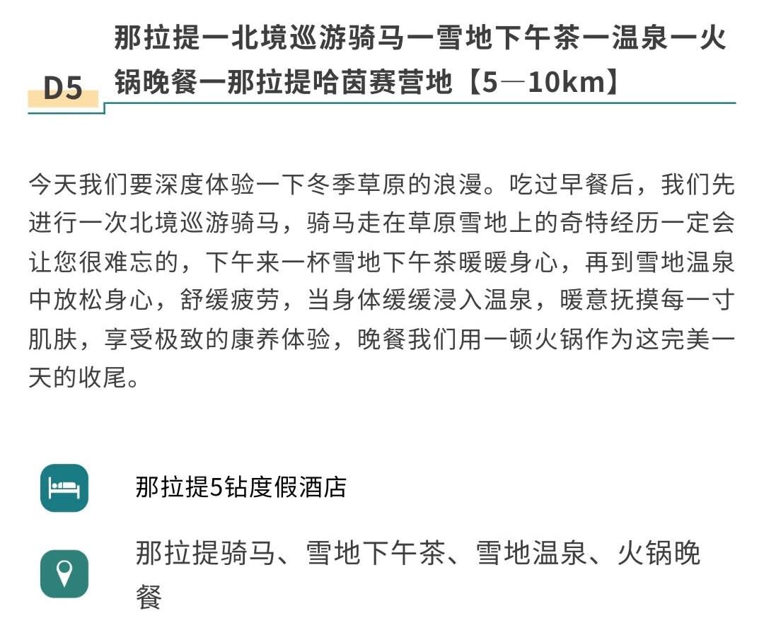 * 5일차: 나라티 - 북경 순유 승마 - 설원 애프터눈 티 - 온천 - 훠궈 저녁 식사 - 나라티 하인세 캠프【5—10km】